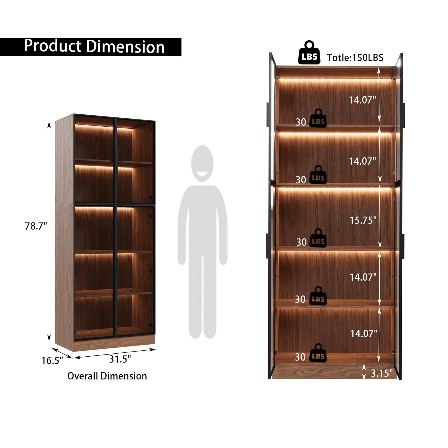 - 【Lighting Options & Enough Storage Space】: Equipped with switch, the glass display cabinet has 3 lighting options to meet your lighting needs: normal white, cold white and warm yellow, which allows to creating stunning atmosphere for your living space and lighting up your decorations. This glass display case with storage features 5 tier which provide you ample storage space for books, photos, plants and other decorations, and comes with walnut glass metal framed one-piece cabinet doors to keep your belongings away from dust.