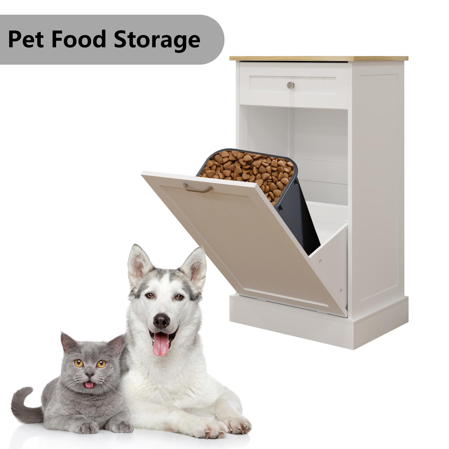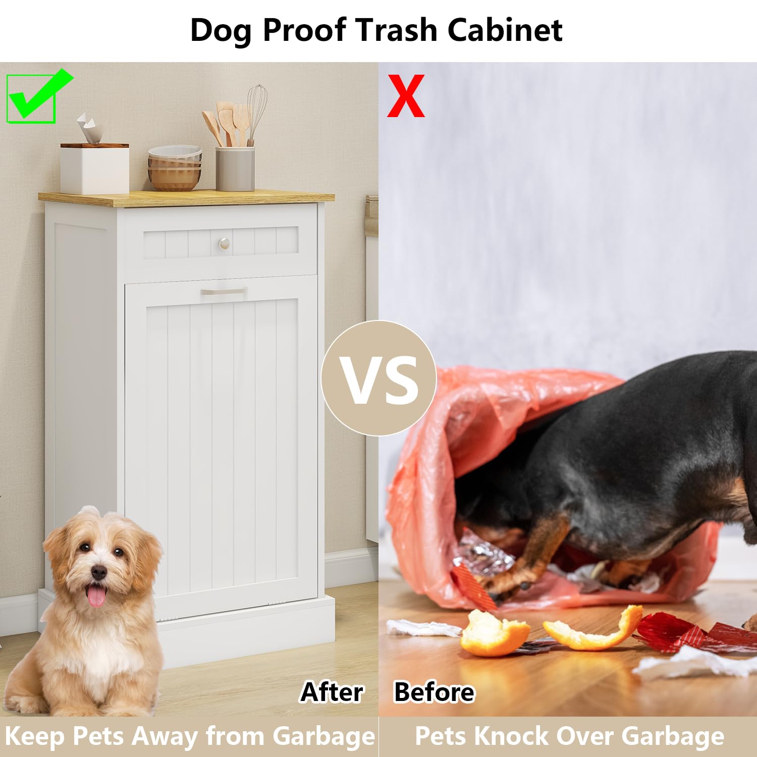 - Aesthetic and Practical - This trash can cabinet with drawer and countertop is perfectly compatible with modern and farm styles, not only a exquisite kitchen trash can, but also can be used as a dirty clothes storage basket. Also, you can also use it as a pet food bin and recycling bin. Great for kitchen,living room, bathroom, bedroom, laundry, office, den, lounge, guest room, pantry and so on.