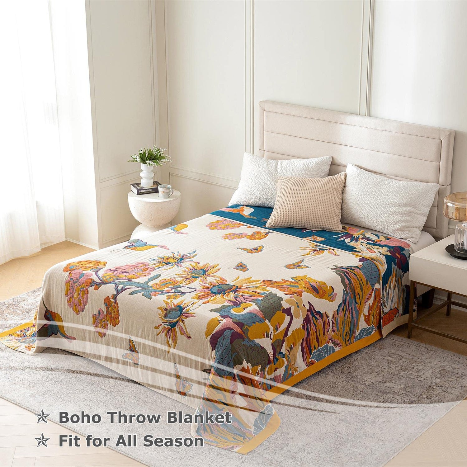 Boho Throw Blanket - 100% Cotton Ultra Soft Bed Throw Large - Fall Blanket Floral Bird and Butterfly Farmhouse Decor Bed Blankets,60"×80" All Season Blanket for Sofa Couch Chair