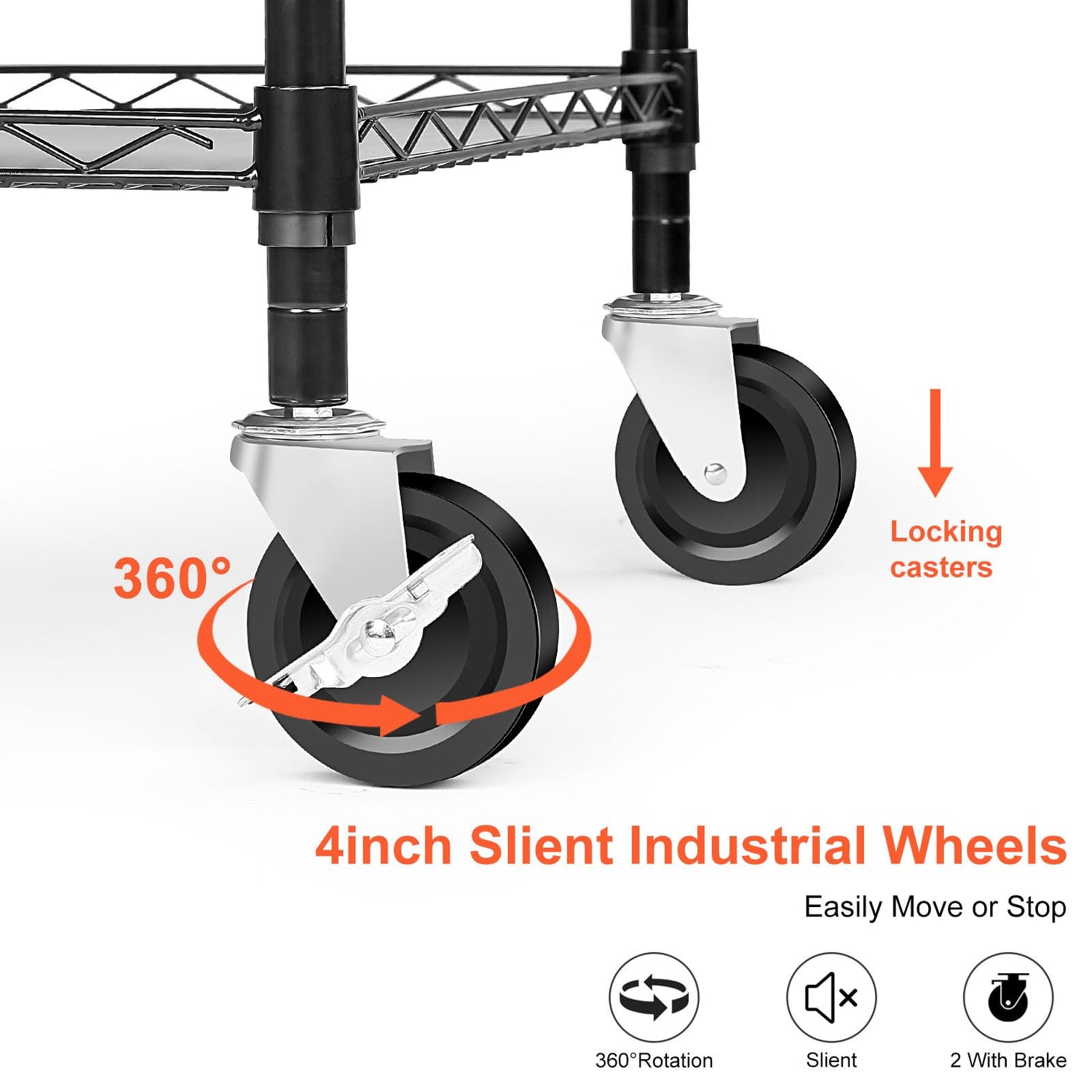 - STURDY CONSTRUCTION & 990LBS CAPACITY: This Rolling Utility Cart made of high quality strength metal with a chrome plated, it offers exceptional resistance to rust and oxidation. Each shelf and basket are made of thicken wires,the highest density in the market to make sure the shelf will not deformation when loaded heavy weight and equipped with 1” diameter poles and 4” industrial wheels make it can hold up to 990lbs on wheels. This carts with wheels is designed for durability and practicality.