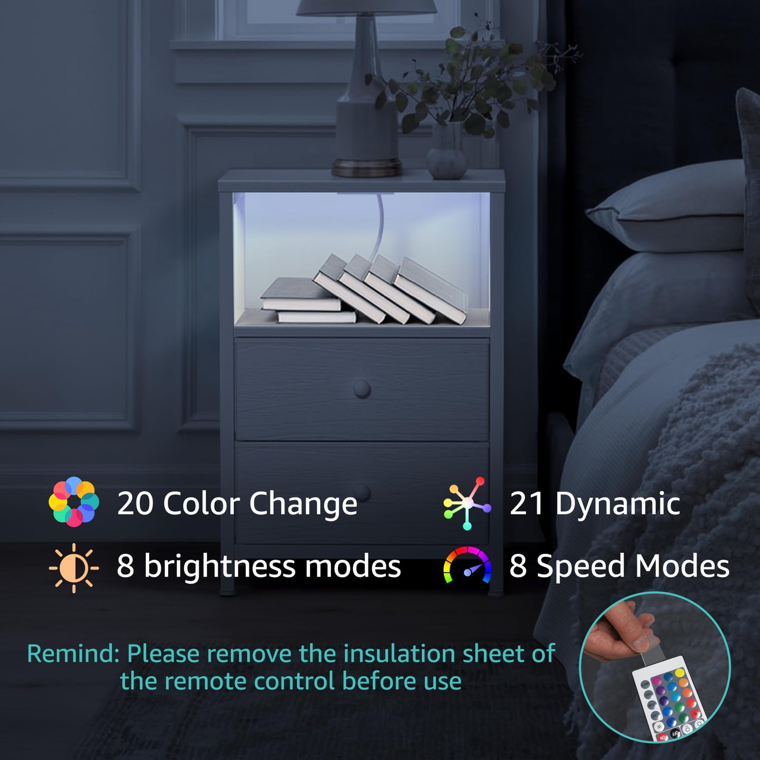 BOLUO White Nightstands Set of 2, Bedroom Night Stand Set Two Nightstand with Charging Station and LED Light, Bedside Table with 2 Fabric Drawers Modern
