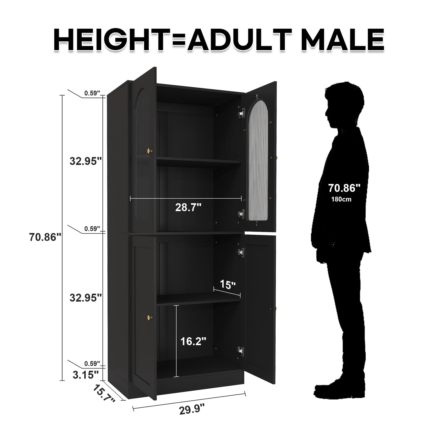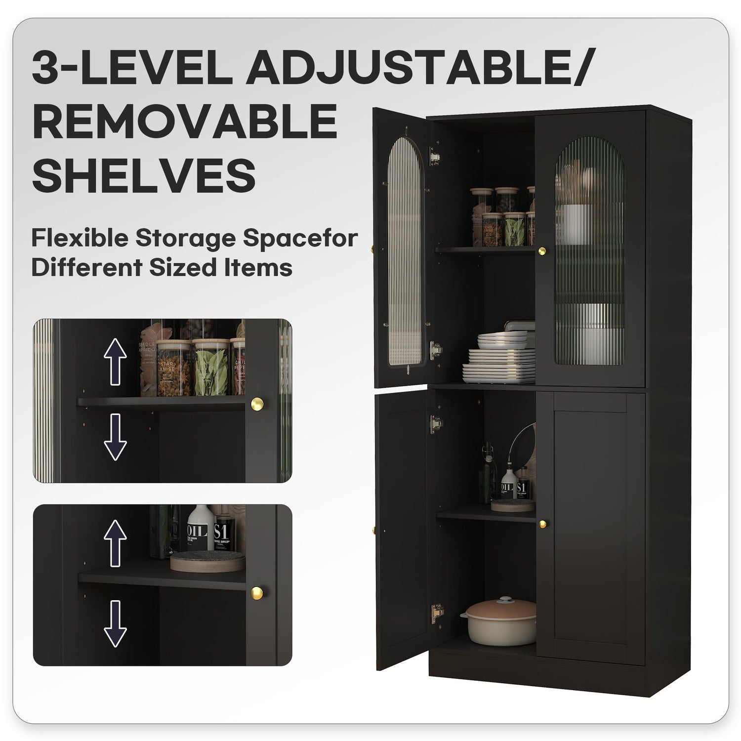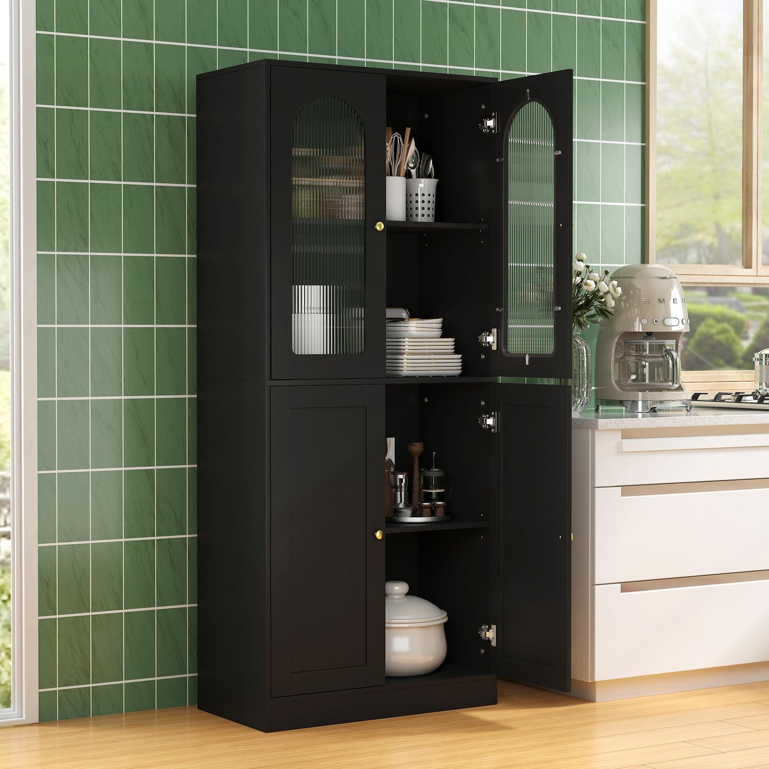 BOMETAO 71" Tall Kitchen Pantry Cabinet, Kitchen Storage Cabinet with Glass Doors and Adjustable Shelves, Wood Food Pantry Cabinet, Freestanding Cupboard for Kitchen, Dining Room, Black