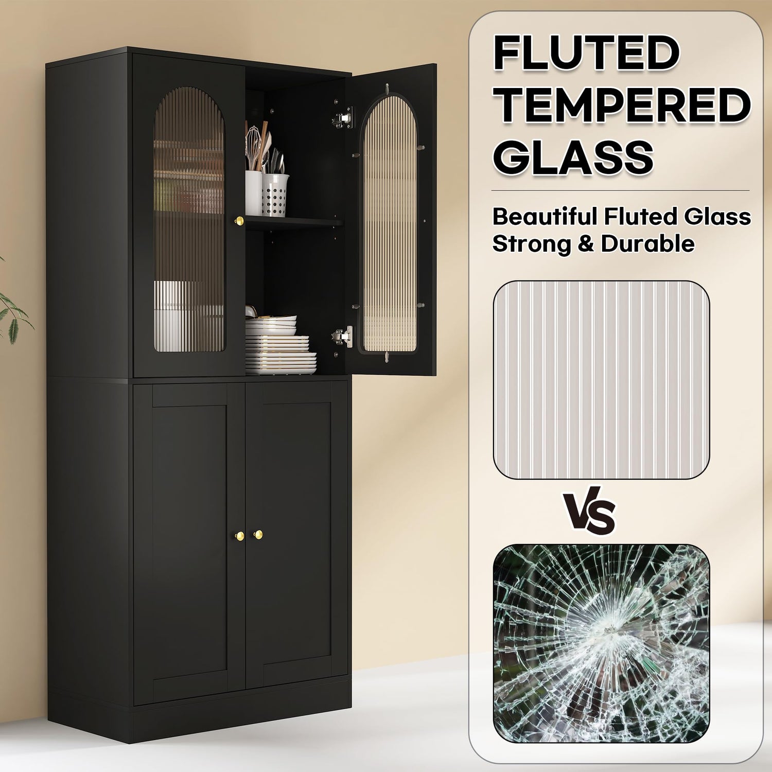 - Sturdy & Stable: Crafted from high-quality MDF wood and fluted tempered glass, not only looks sleek with its smooth, easy-to-clean surface, but also is durability. Tempered glass is stronger than regular glass, providing better resistance against external force and reducing the risk of accidental breakage. Additionally, the flat and smooth surface makes it less prone to dust and dirt, ensuring easy cleaning and maintenance.Plus, this tall storage cabinet comes with an anti-tipping device and support slat for added safety and stability, ensuring safety around children and pets
