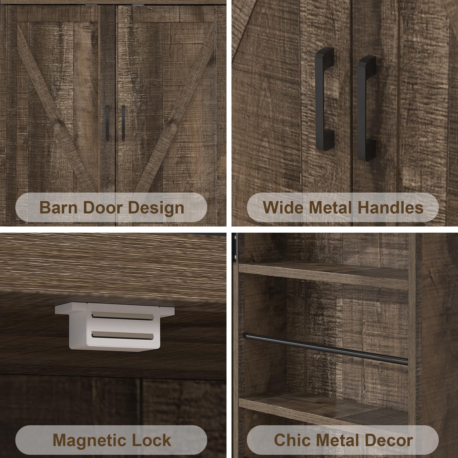 - ELEGANT FARMHOUSE STYLE: Featuring X-shaped barn doors, clean brown body and classic black metal handles, the BOMETAO pantry cabinet fuses seamlessly contemporary aesthetic with farmhouse elements, which creats a touch of warm homy vibe and blends easily with most decors. Our Kitchen pantry cabinet features with two double-door cabinets and one large center drawer which can provide spacious space to store your kitchen items. Every area is utilized here, with the wooden racks on the doors offering space for small tins and jars.It is suitable for most renovations and adds storage functionality in the living room, dinning room, bathroom, kitchen