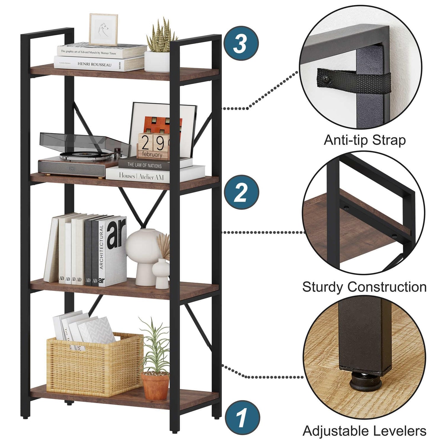 BON AUGURE Rustic Oak 4-Tier Industrial Bookshelf – Modern Open Etagere for Home and Office