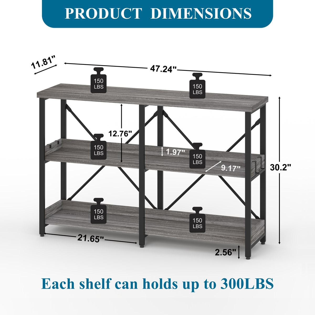 With dimensions measuring 11.81"D x 47"W x 30.12"H, this front door table fits seamlessly into various spaces. The striking matte black metal frame, paired with grey wood grain finish shelves, offers an elegant touch that blends farmhouse charm with contemporary flair.