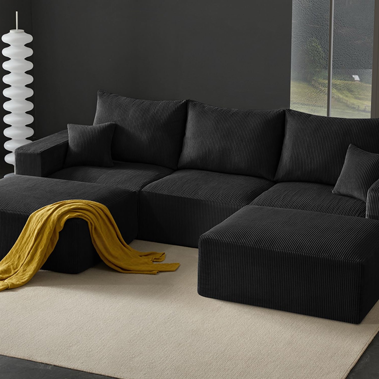 Boneless Sectional Cloud Couch Sofa for Living Room, 112" U-Shaped Modular Modern Lounge Sleeper Black Couches with Chaise, No Assemble, Cordury Compression Upholstered Sofas