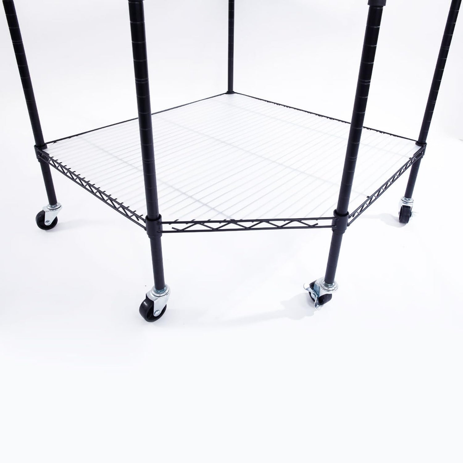 - CONSIDERATE DESIGN: 1. All-direction mesh border to prevent items from dropping off. 2.This powder–coated shelving stand does not rust or corrode with normal use.The coating makes it looks much nicer and less industrial. 3. Casters (2-inch diameter) allow for easy positioning in the kitchen, garage, or office 4. Adjustable height of each layer for random adjustment. Wire shelves adjustable in 1-inch increments.