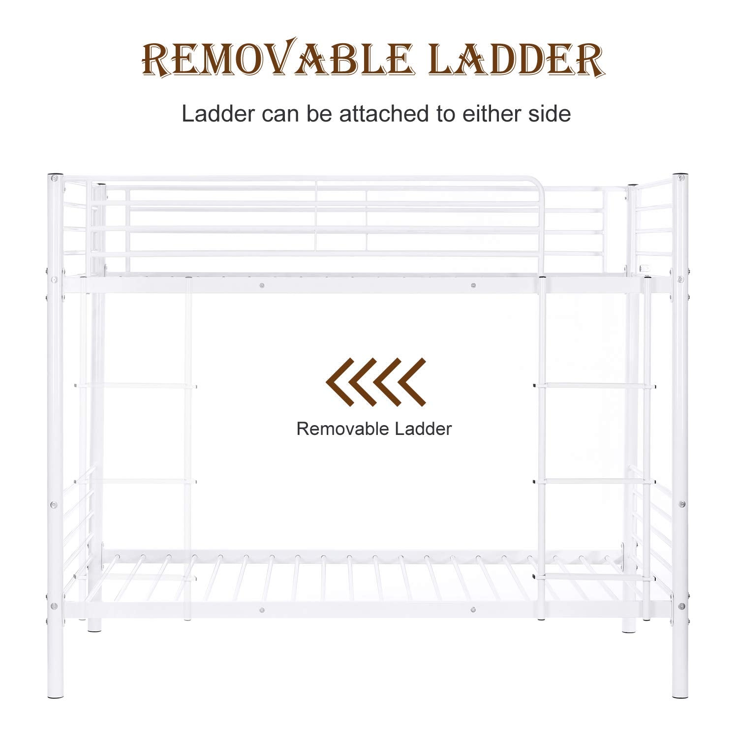 - 【Sturdy metal frame】This white bunk bed twin over twin is made of steel construction with powder coated finish. Metal support slats included, no box spring needed. Comes with two optional brackets to affix it to the wall for added security. Weight Capacity: 330 pounds (upper)/440 pounds (lower)