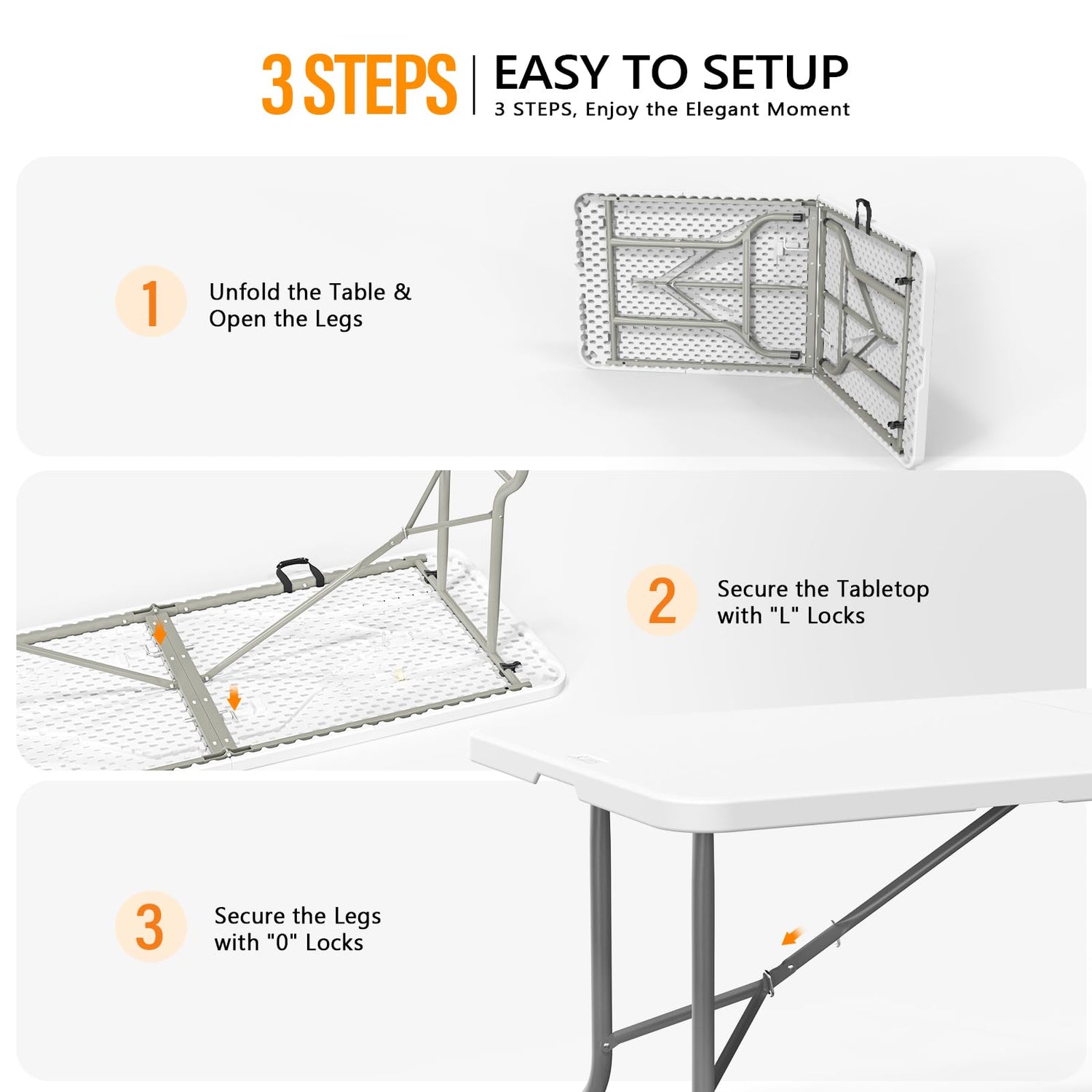 Bonnlo Folding Table 6ft, Portable Collapsible Plastic White Long Tables for Party, Camping, Banquet, Craft, Dining, Wedding, Outdoor and Indoor Use