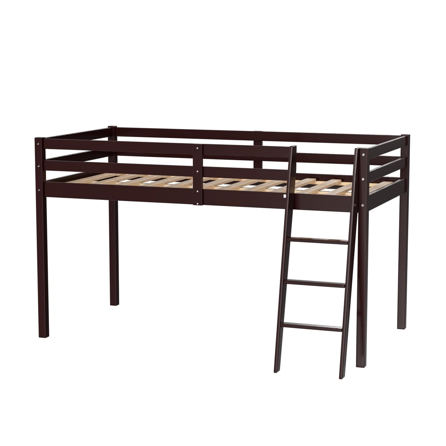 Bonnlo Espresso Twin Low Loft Bed with Inclined Stairs and High Guard Rail