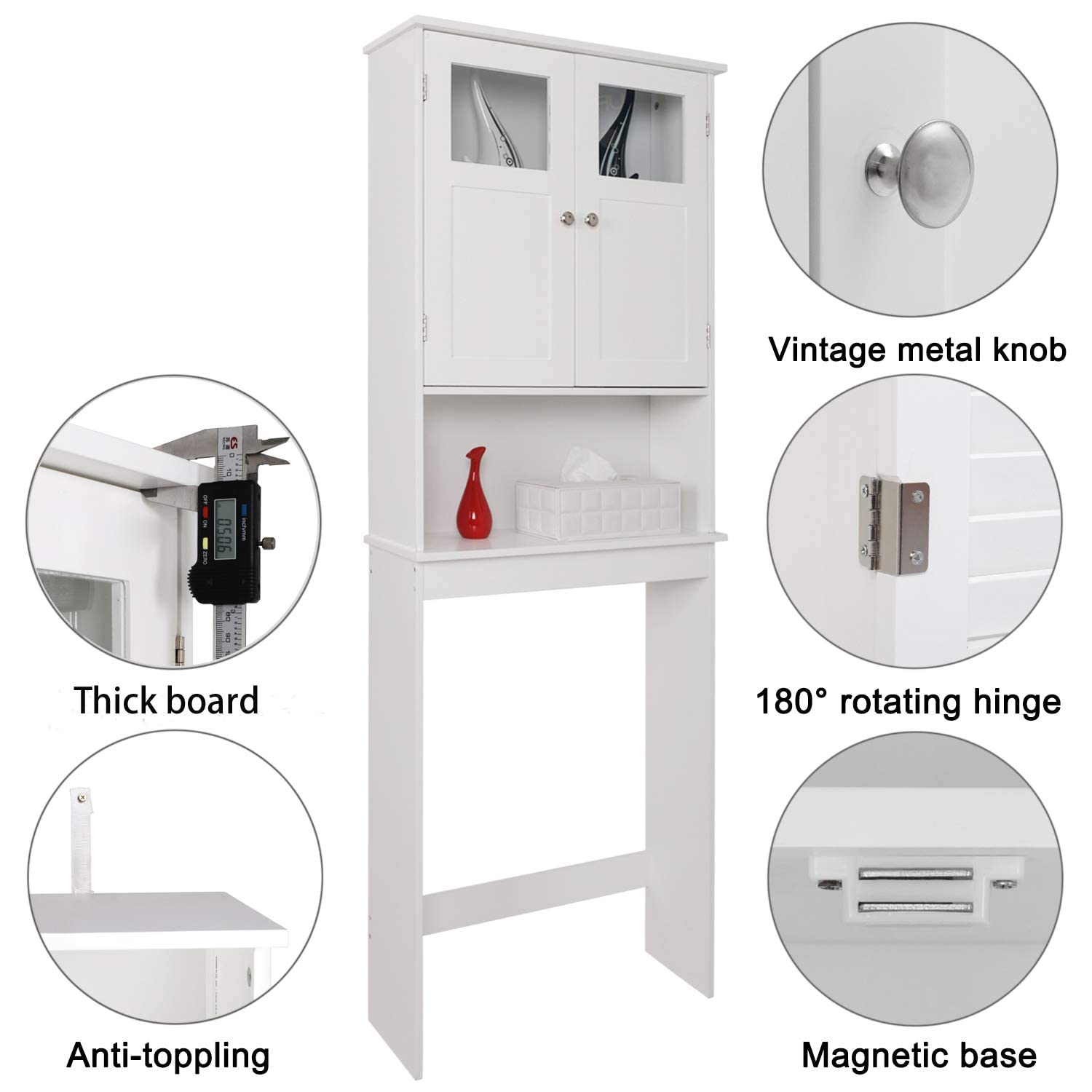 - 【Sturdy and Stable】- Made of waterproof and moisture-proof sturdy P2 MDF, this bathroom organizer over toilet storage is built to last. The smooth white finish adds a modern touch to your bathroom decor.