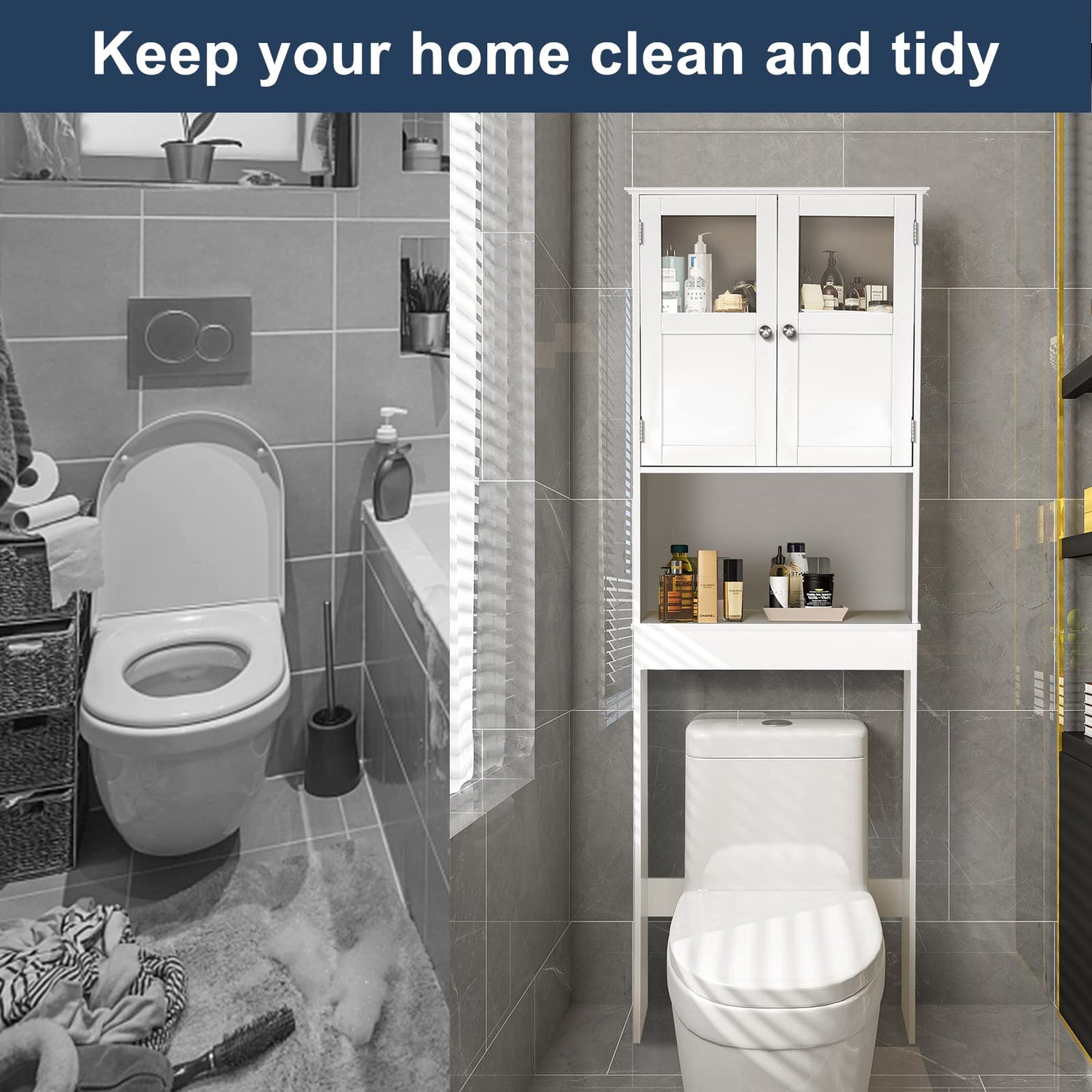 Bonnlo Over The Toilet Storage Cabinet with Adjustable Shelf White Bathroom Floor Organizer Space Saver with Double Doors, 67" Height