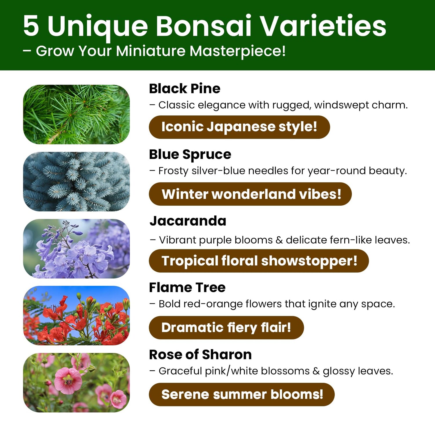- 🌳 5 Unique Japanese Bonsai Tree Varieties: Grow and nurture 5 distinct bonsai trees, including Black Pine, Blue Spruce, Jacaranda, Flame Tree, and Hibiscus (Rose of Sharon). Each variety offers a unique aesthetic, making this kit perfect for plant enthusiasts and beginners alike.