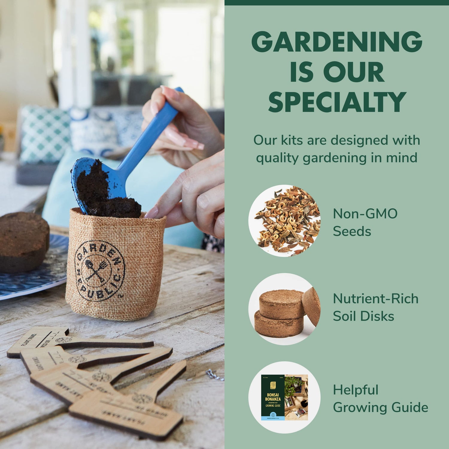 - Complete DIY Starter Bonsai Tree Kit – Our indoor bonsai tree kit comes with everything you need. Three types of bonsai seeds, jute planter bags, pruning shears, nutrient-rich soil discs, plant markers, and an easy-to-follow guide.