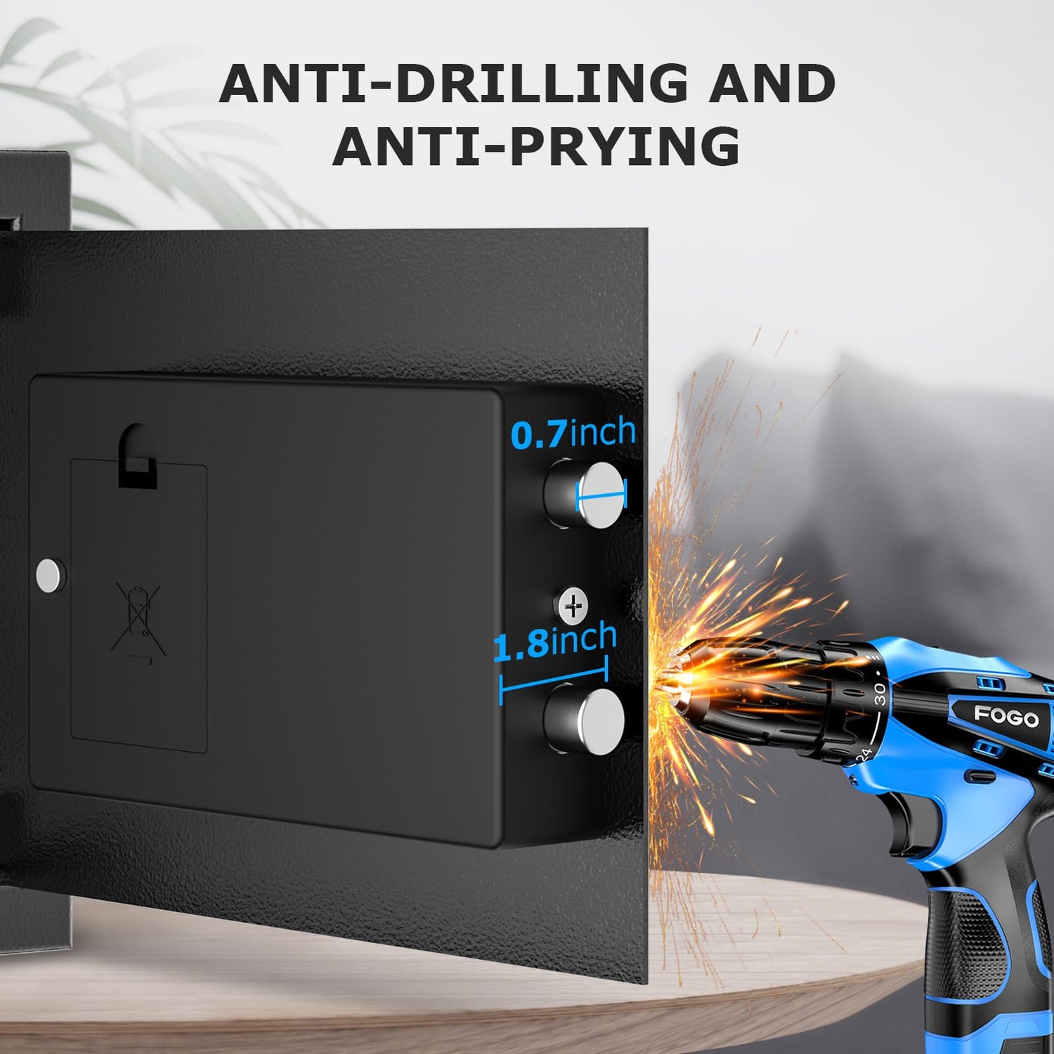 • SECURE AND DURABLE: Constructed with SPCC steel, this safe is strong and reliable. It features two 18mm diameter active locking bolts, providing maximum security and protection for your valuables; The safe has undergone rigorous testing, proving its outstanding durability and material quality