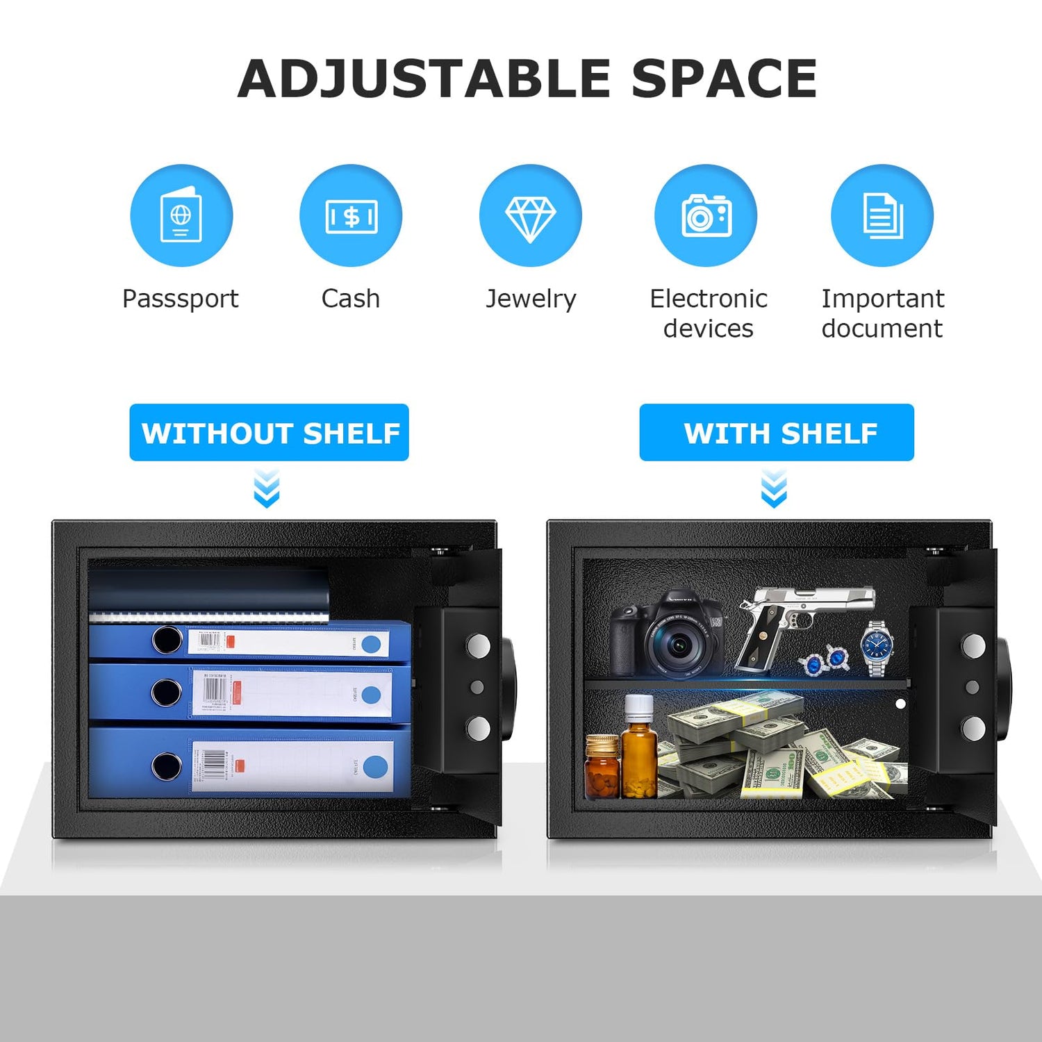 • 0.6 CUBIC FEET CAPACITY: The bonsaii lockable storage box comes equipped with a removable shelf, offering flexible storage options for consumers' valuables; It can securely store important documents and jewelry with ease