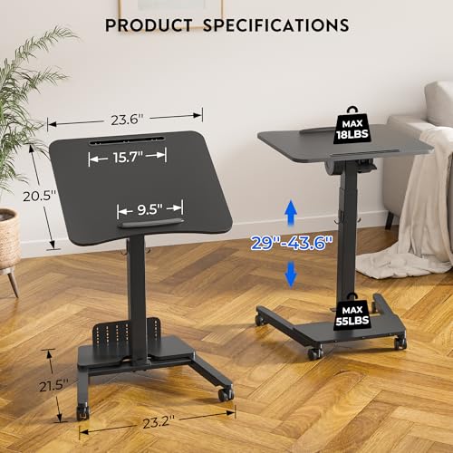 - ✅ DURABLE, STURDY DESIGN - Constructed from high-quality materials, this mobile desk offers excellent stability. The 23.6" x 20.5" tilting desktop supports up to 18lbs, providing a reliable surface for laptops, monitors, and more. Built for daily use, it ensures stability and long-lasting performance
