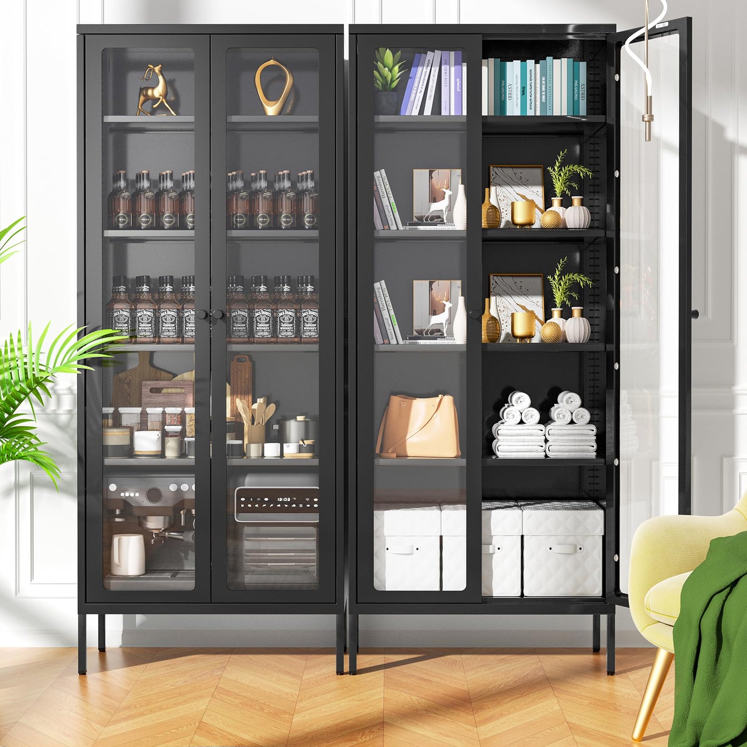 - [Modern&Simple Design]:This glass display cabinets are with the support of the advanced painting process, the color of the surface of this cabinet has been well displayed, and two rounded handles on the door are in the same color design.so as to achieve modern & Simple design concept.This product is suitable for placing in various scenes, such as office, bedroom, study, game room,etc..Besides this metal storage cabinets are also suit for to be a gift for your friends and relatives.