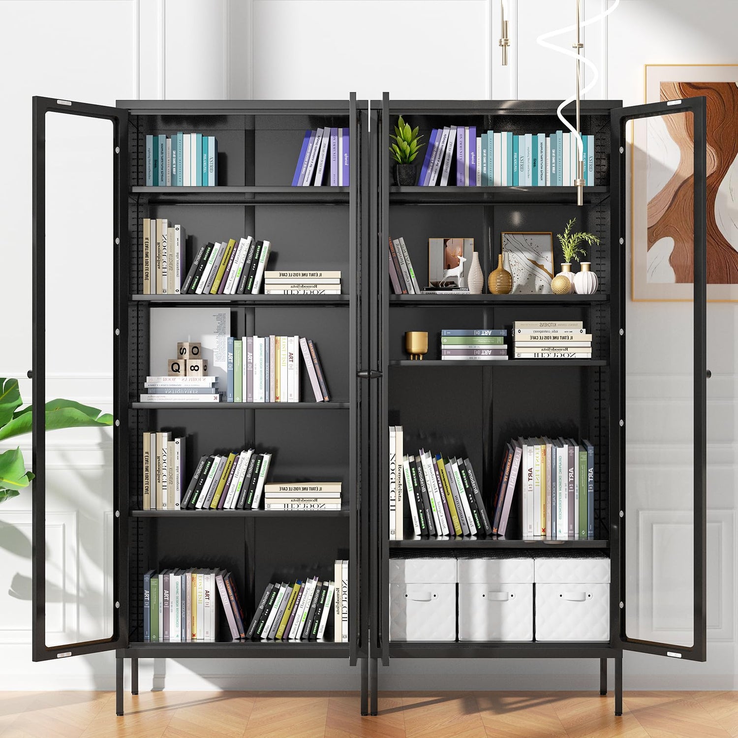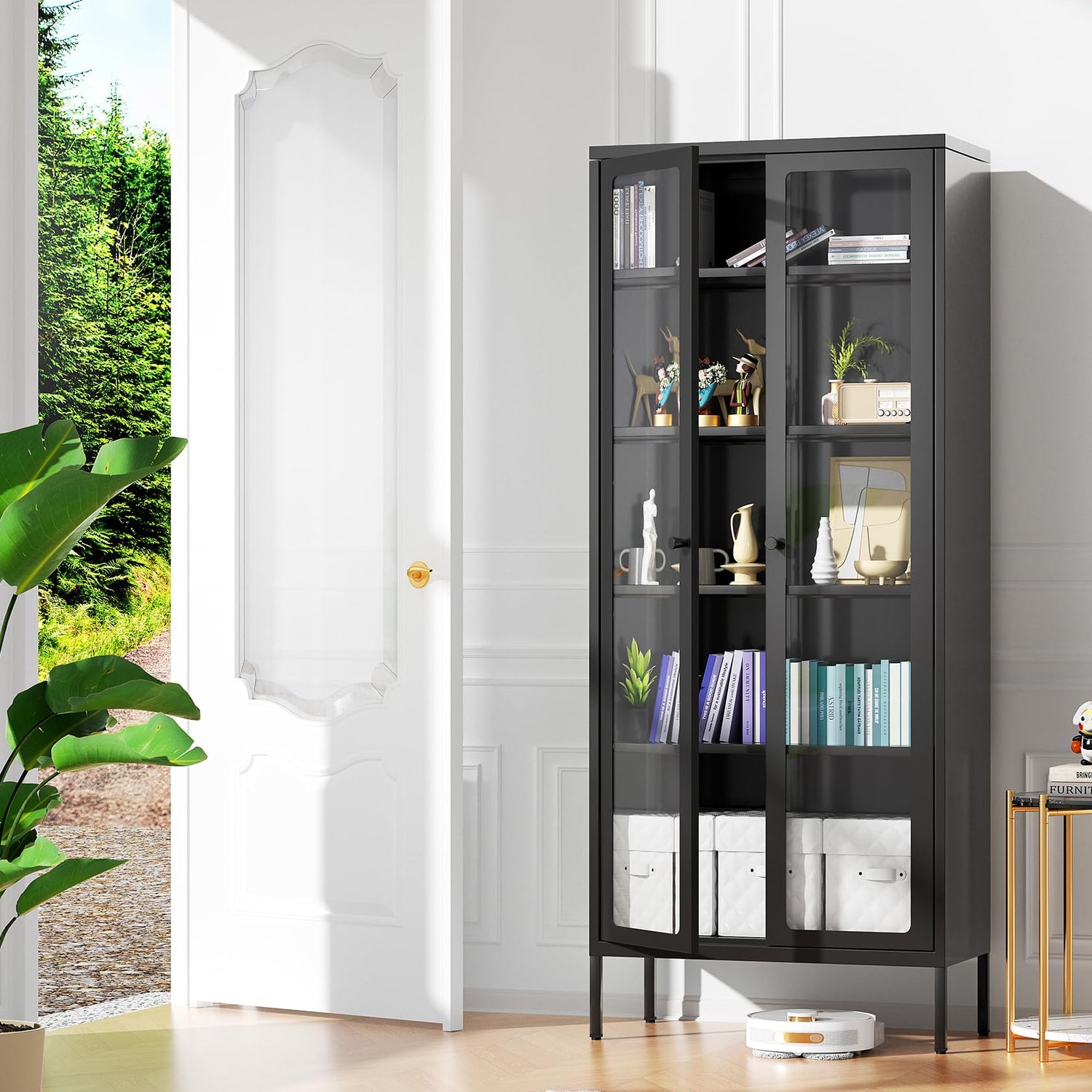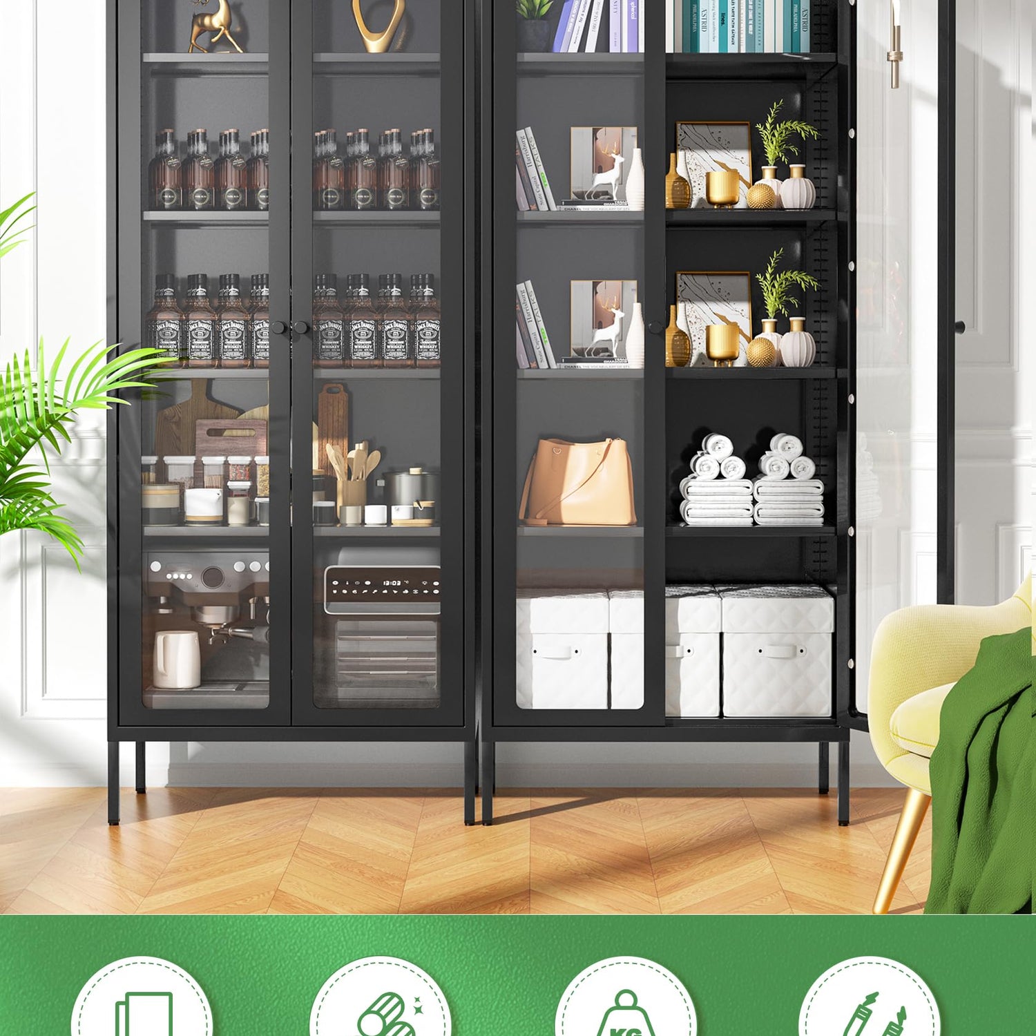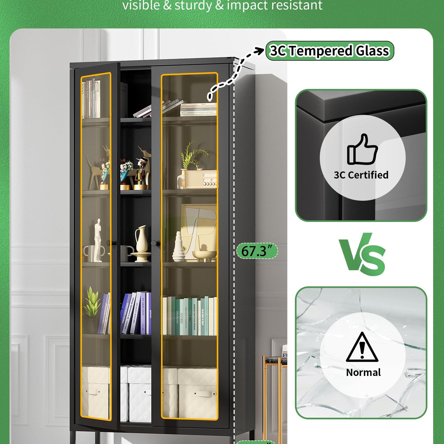 Bonusall Display Cabinet with Glass Doors,67” Metal Display Curio Cabinet with Glass Doors and 4 Adjustable Shelves for Collectibles,Home Office,Living Room,Gaming Room(Black)
