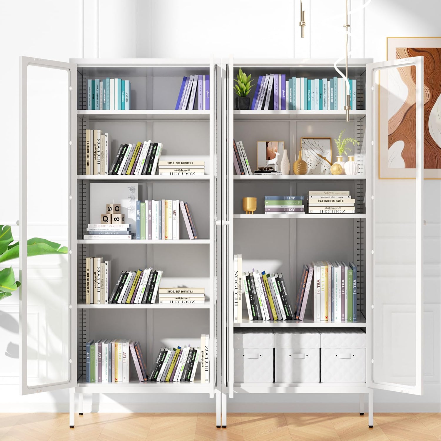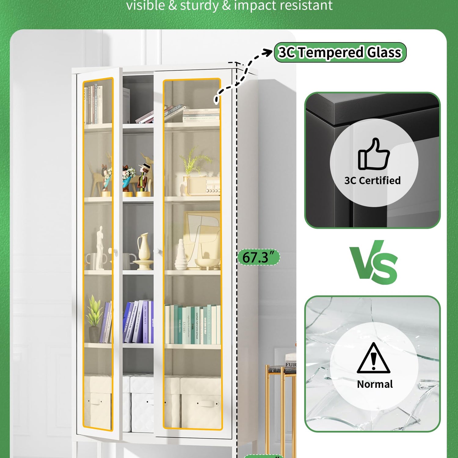 Bonusall Display Cabinet with Glass Doors,67” Metal Display Curio Cabinet with Glass Doors and 4 Adjustable Shelves for Collectibles,Home Office,Living Room,Gaming Room(White)