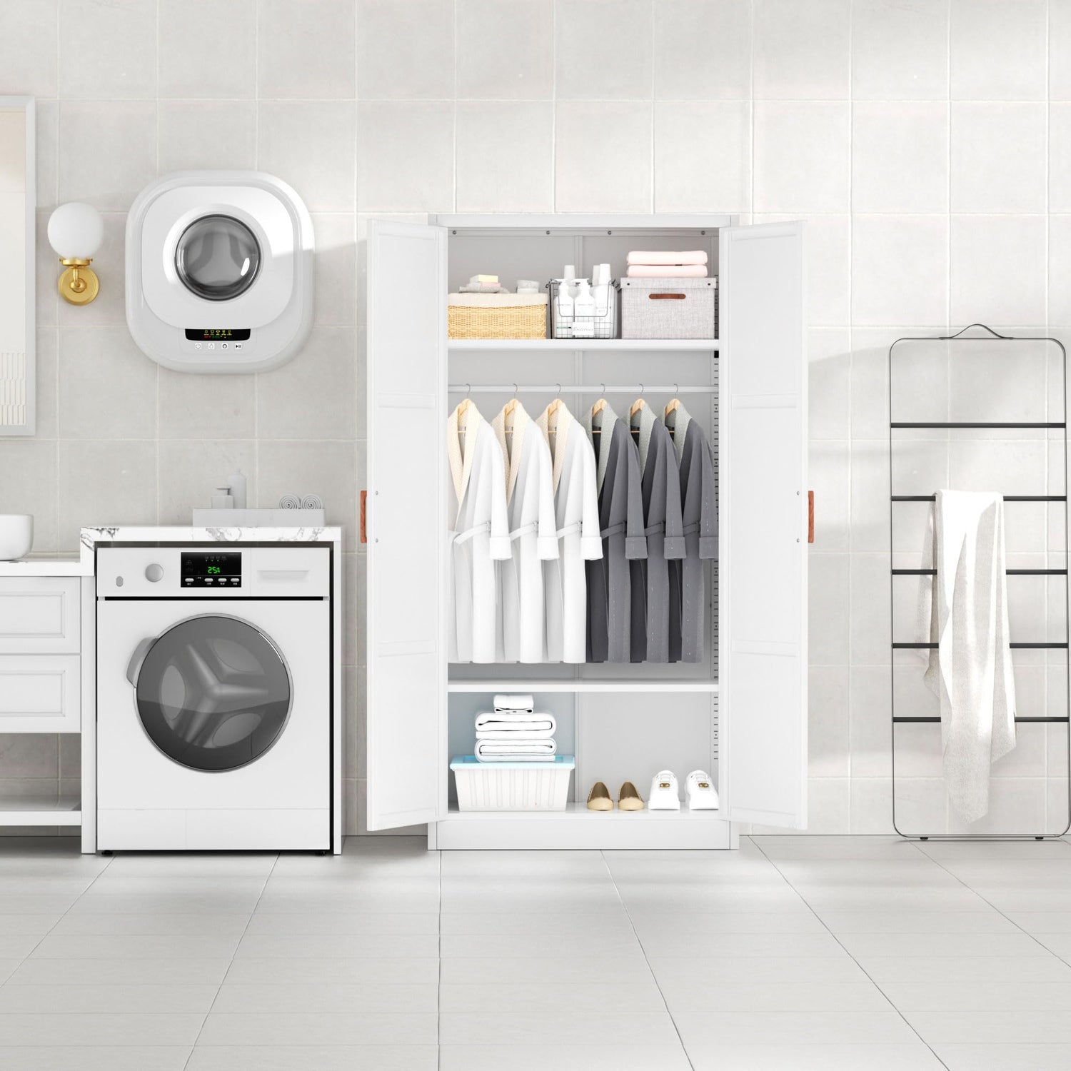 Bonusall Metal Wardrobe Cabinets with Single Rod and 2-Shelves, 70" Heavy-Duty Steel Clothing Storage Cabinets with 2 Doors, White Armoire Wardrobe Closet for Bedroom, Laundry Room or Living Room