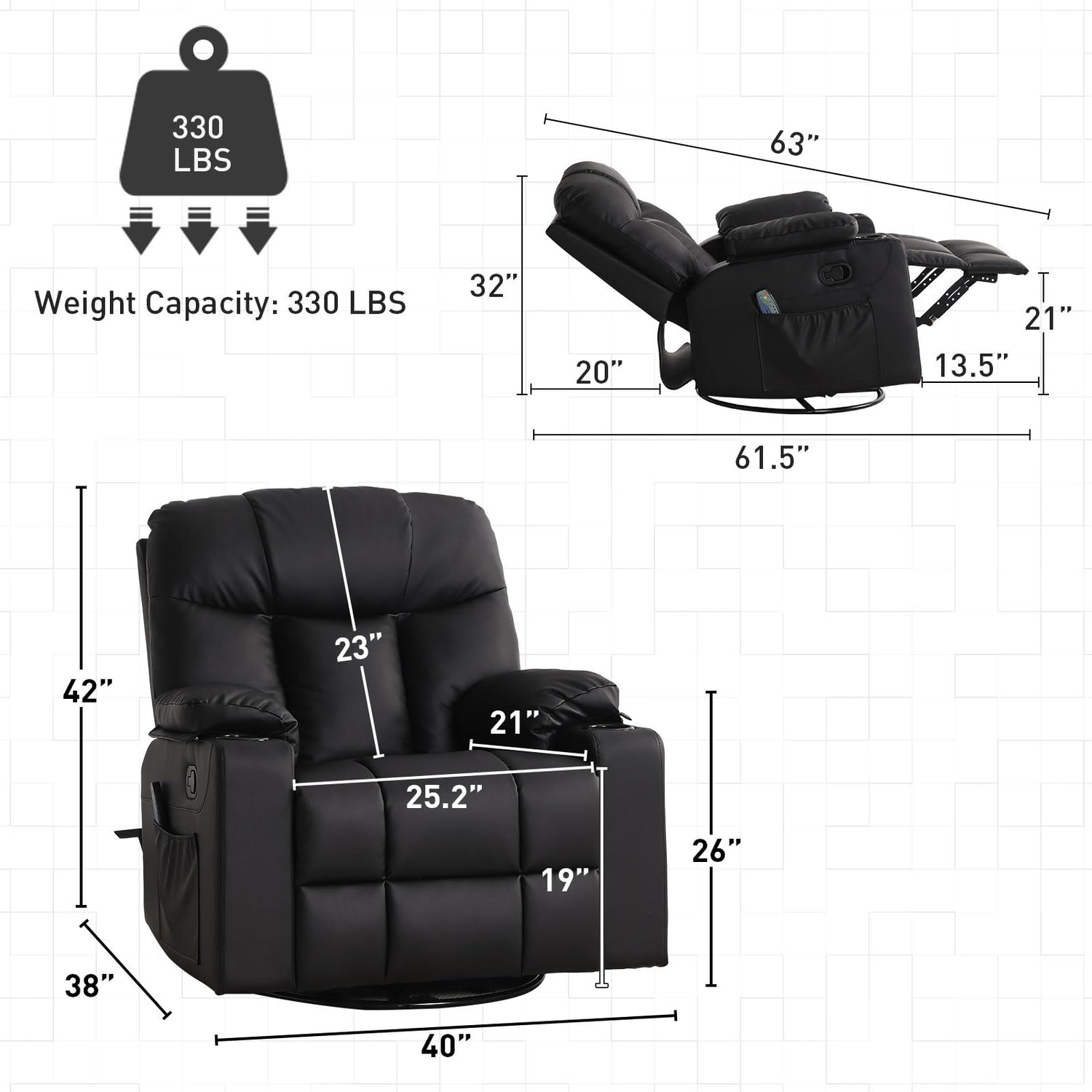 - Oversized Recliner: This luxurious rocking recliner chair dimension is 38"D x 40"W x 42"H, seat dimension is 21"D x 25.2"W x 19"H, its 25.2" widened seat, strong wooden frame and heavy-duty metal base ensures a weight capacity up to 330 lbs, perfect fits most big man.