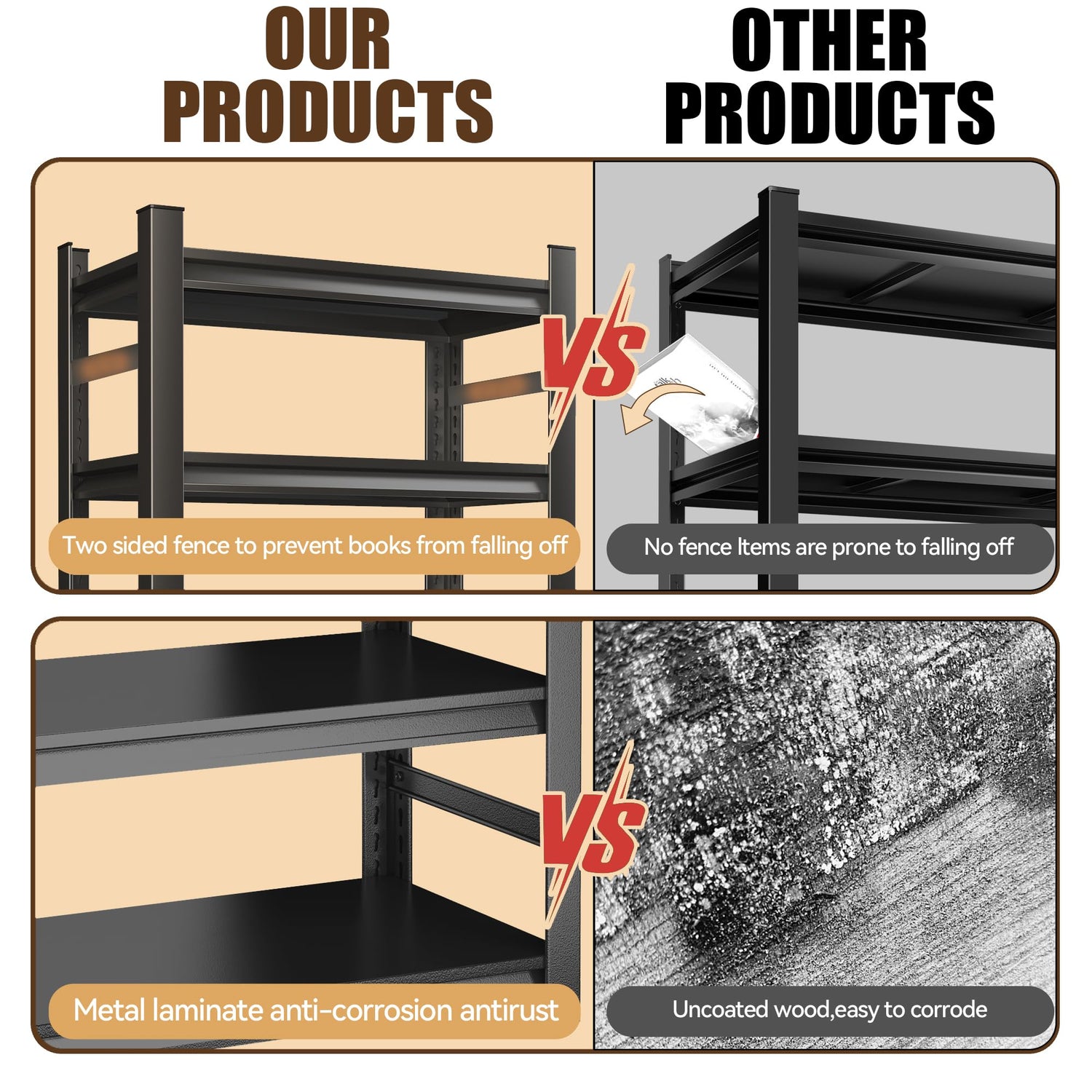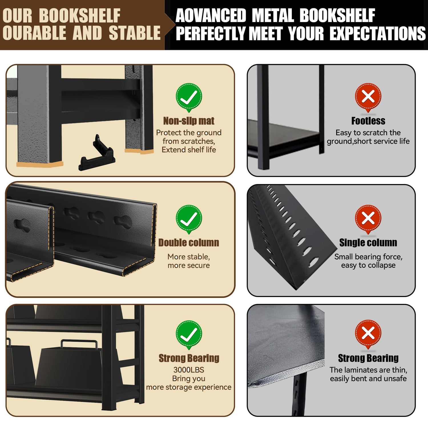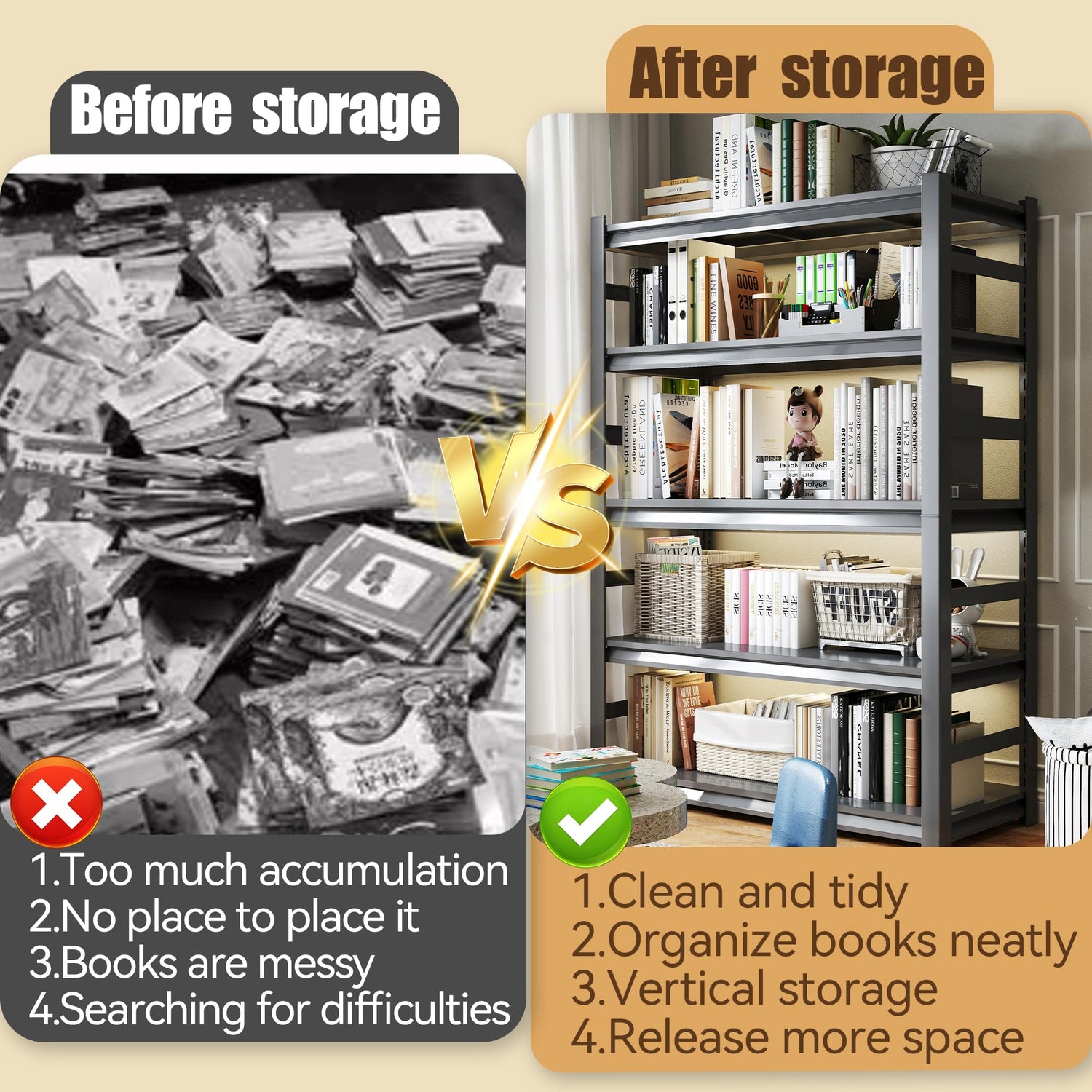 - [Multi-function Storage Shelving] This black bookshelf offers 5 tiers of open storage, each holding up to 600 pounds. It’s perfect for organizing books, garage kits, CDs, souvenirs, and electronics. This black bookshelf adds a practical and stylish touch to your living room, study, or bedroom. The metal bookshelf brings a modern look and helps keep your home neat and organized