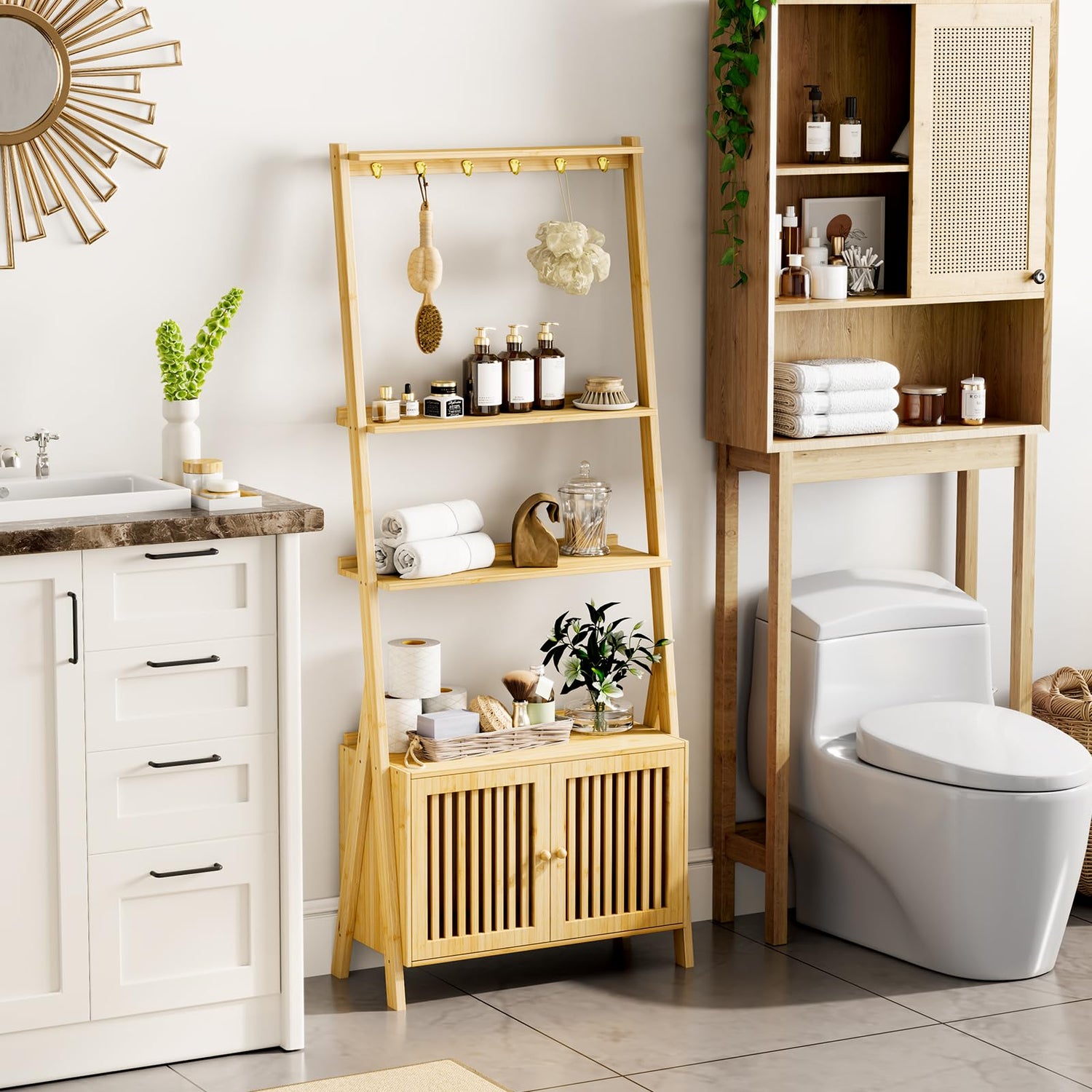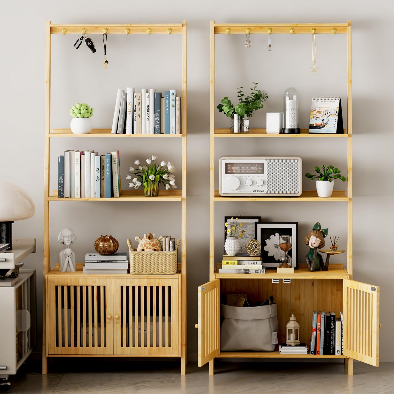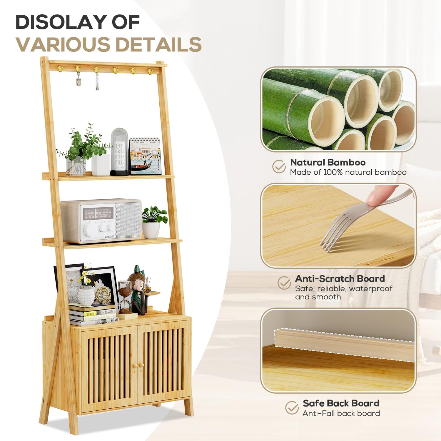 - 【Large Capacity Ladder Bookshelf】- This ladder shelf bookcase features 3 open shelves, 6 hooks and a storage cabinet with doors. Each shelf's edge is designed with a safety back panel to prevent items from falling. The bottom cabinet with doors can store your important documents or personal items so as to guarantee your privacy. Provides you with ample space to place family photos, books, plants, decorations, CDs or other daily necessities.
