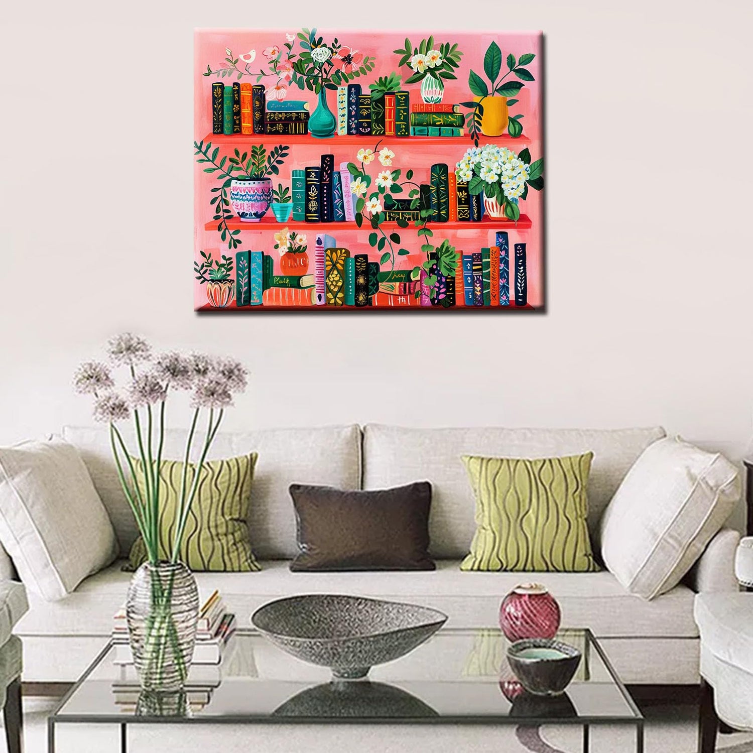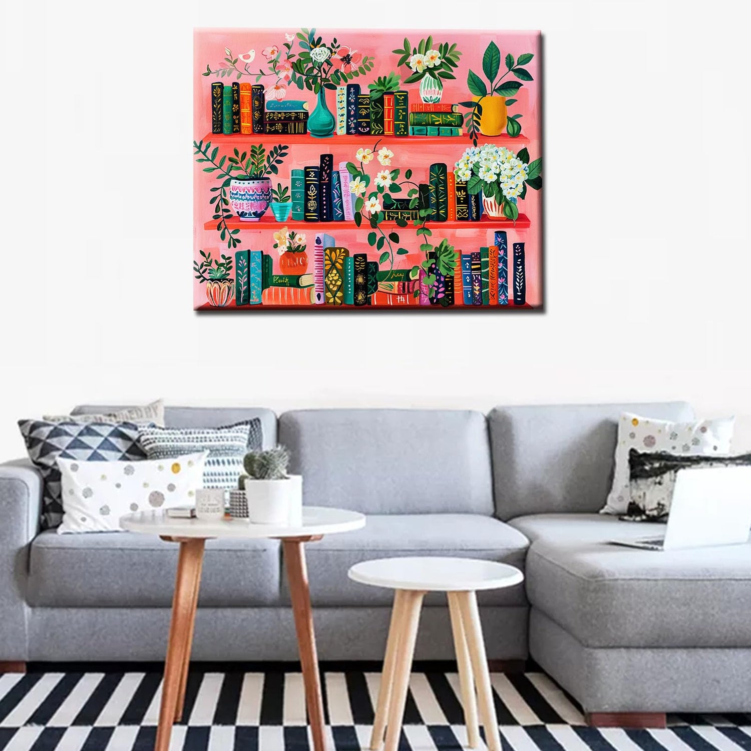Bookshelf Book Theme Pink Library Paint by Numbers Kits for Adult Paint by Numbers Boho Painting Kits on Canvas with Brushes and Acrylic Pigment for Home Wall Decor Without Framed 16''W x 20''H