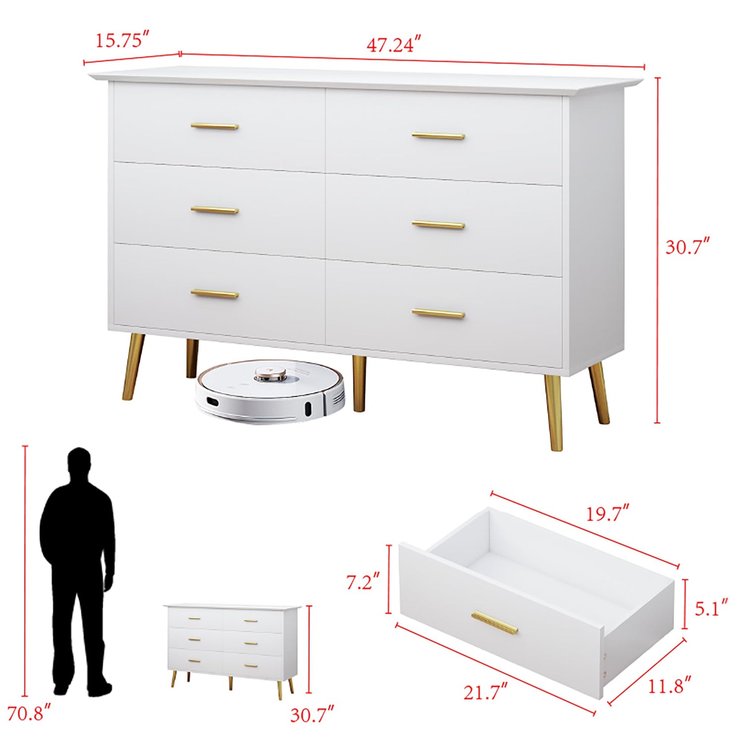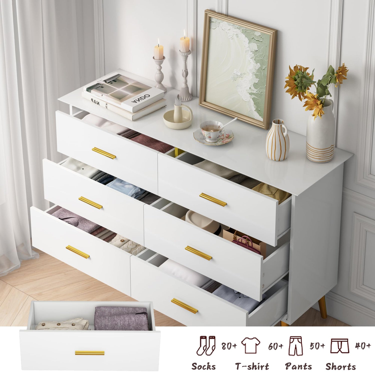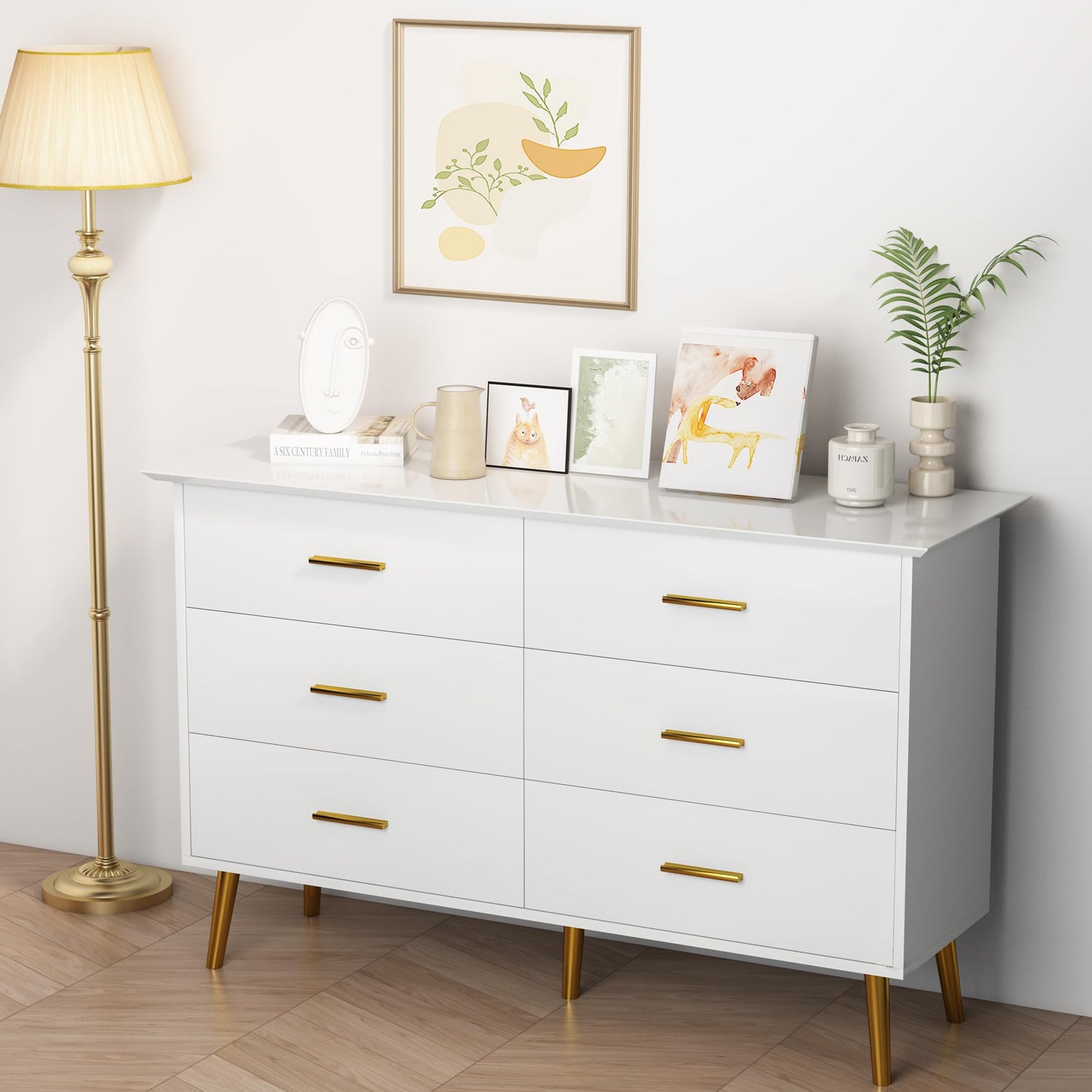 Boonatu White Dresser for Bedroom with 6 Drawers, White Dresser, Wood Dressers Chest of Drawers with Gold Handles, Modern LED Bedroom Dresser with Drawers for Closet Hallway, Living Room, White
