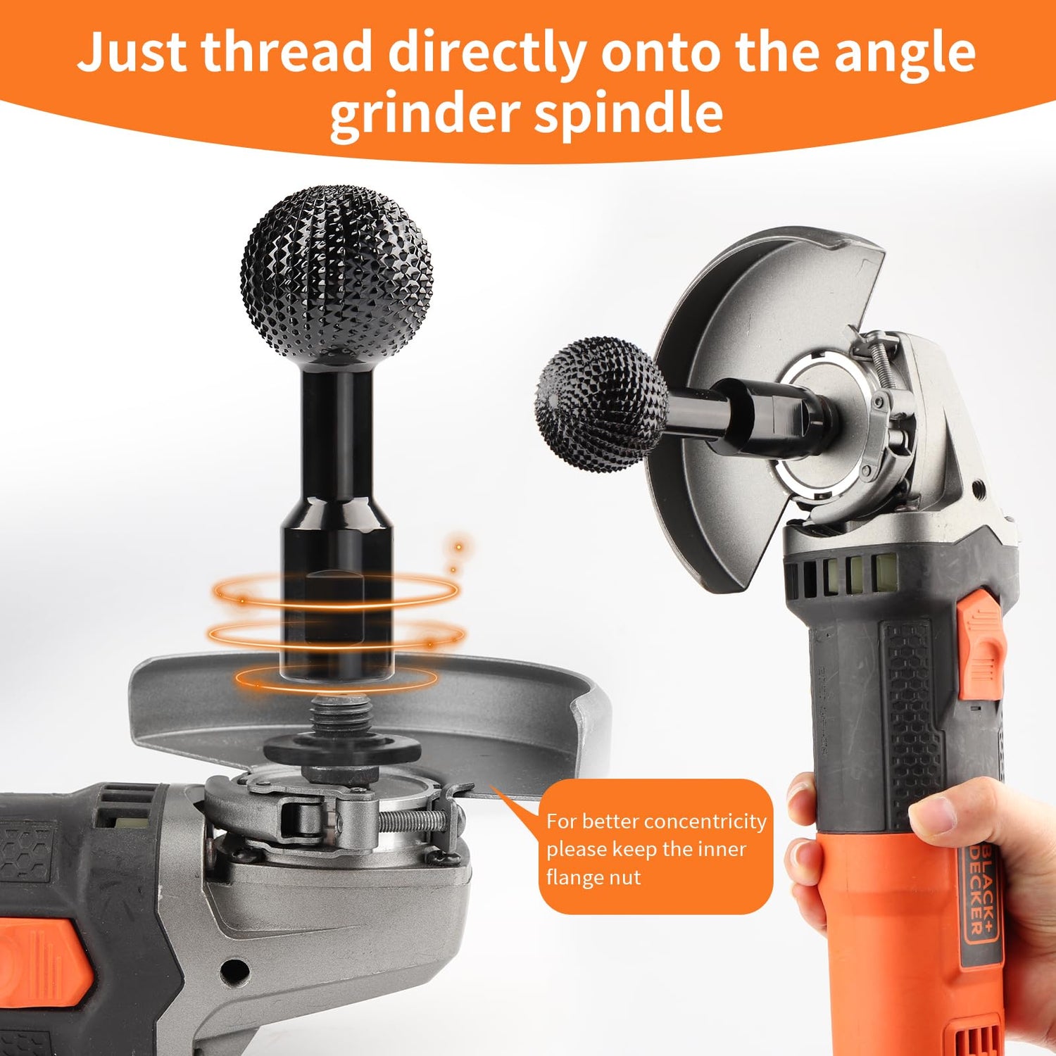 - Compatibility: The sphere rotary burr is designed to fit a standard 4 1/2 or 5 inch American angle grinder with 5/8-11 threads. (Please note that the inner flange nut on the angle grinder should not be removed.)