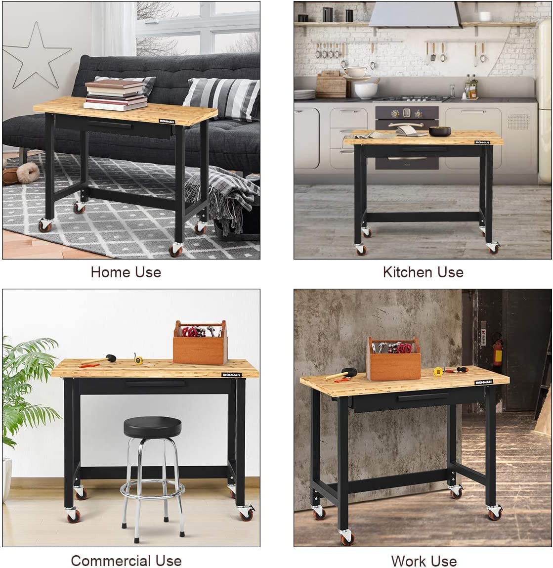 BOSEO Workbench, 48" Wild Mobile Workbench, Solid Wood Top Workbench for Garage, 500 LBS Workbench with Two Lockable Casters, Sliding Organizer Drawer