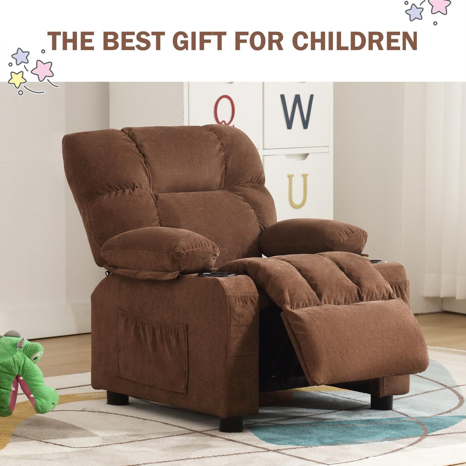 BOSMILLER Kids Recliner Chair, Push Back Toddler Recliner with Cup Holders & Side Pockets, Adjustable Footrest & Headrest Kids Sofa for Boys Girls 3+ Age Group (Deep Brown)
