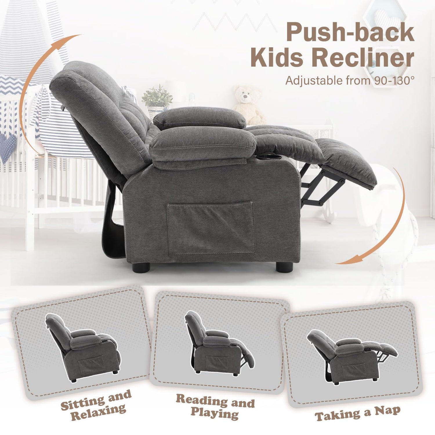 BOSMILLER Kids Recliner Chair, Push Back Toddler Recliner with Cup Holders & Side Pockets, Adjustable Footrest & Headrest Kids Sofa for Boys Girls 3+ Age Group (Light Brown)