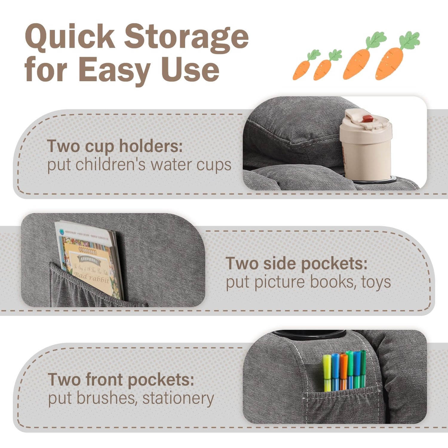 - 🧸【THOUGHTFUL DESIGN】: the chair has multiple storage designs, and cup holders on both sides, which can hold the child's water cups and will not easily topple over. The larger bag on the side can hold the child's picture books or toys, and the smaller bag in front can hold stationery such as paintbrushes. The child is very convenient to use, after use can also be timely storage, and will not mess up the room. Can become a good partner for children to play and rest.