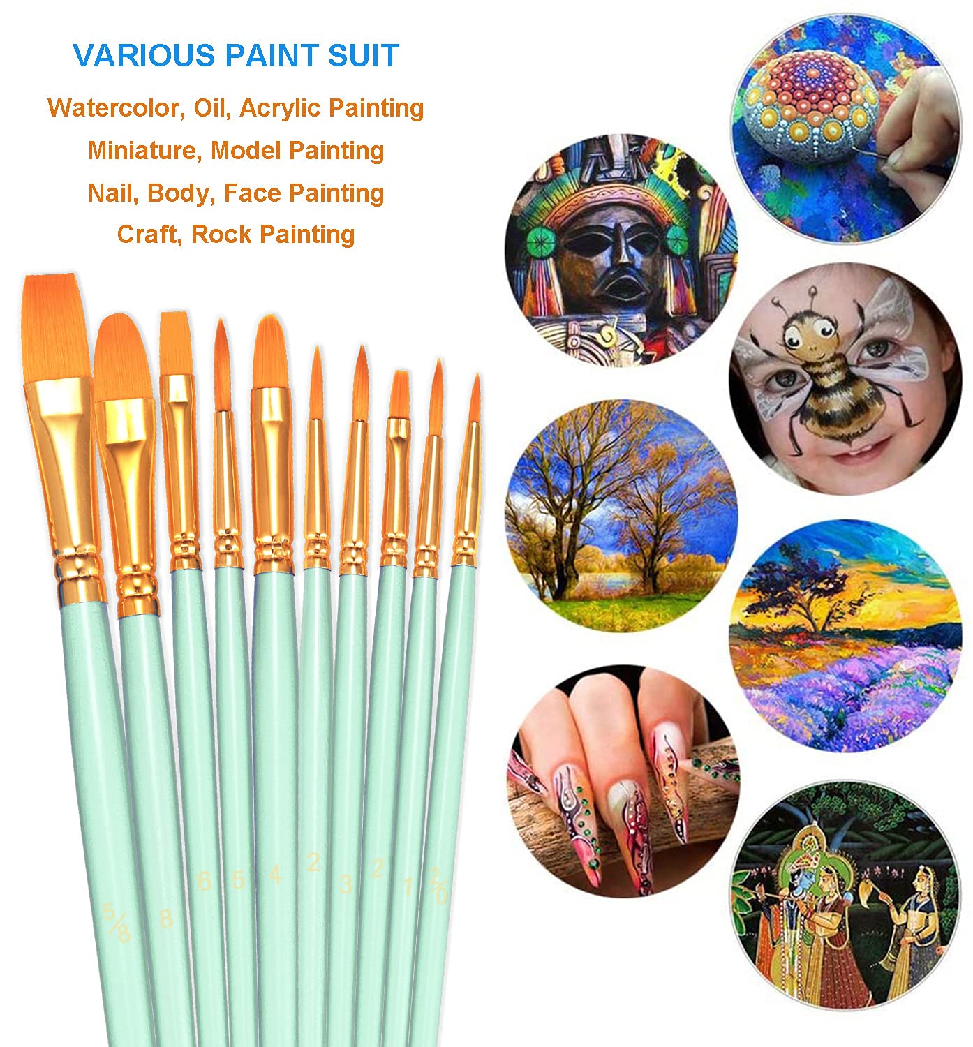 - ► WARM TIPS: Clean your brushes immediately after using them, avoid scrubbing while cleaning. Never leave your brushes resting on their heads in water, solvent, or when drying. Store clean brushes vertically, head-side-up or horizontally. What You Get: 10pcs artist brushes set * 2 and friendly customer service, if you have any question with your painting kit, be free to contact us and we will make it right for you within 24 hours.