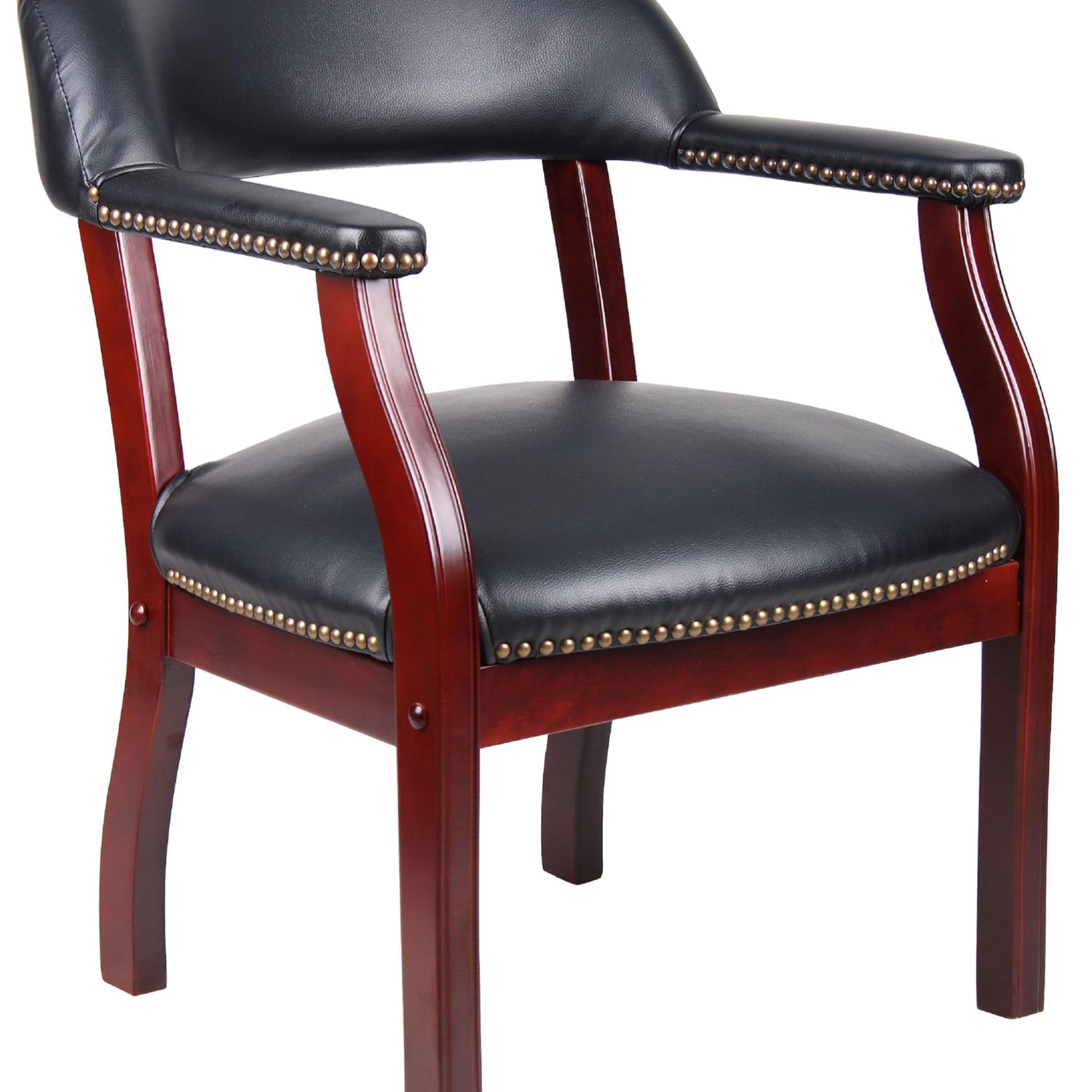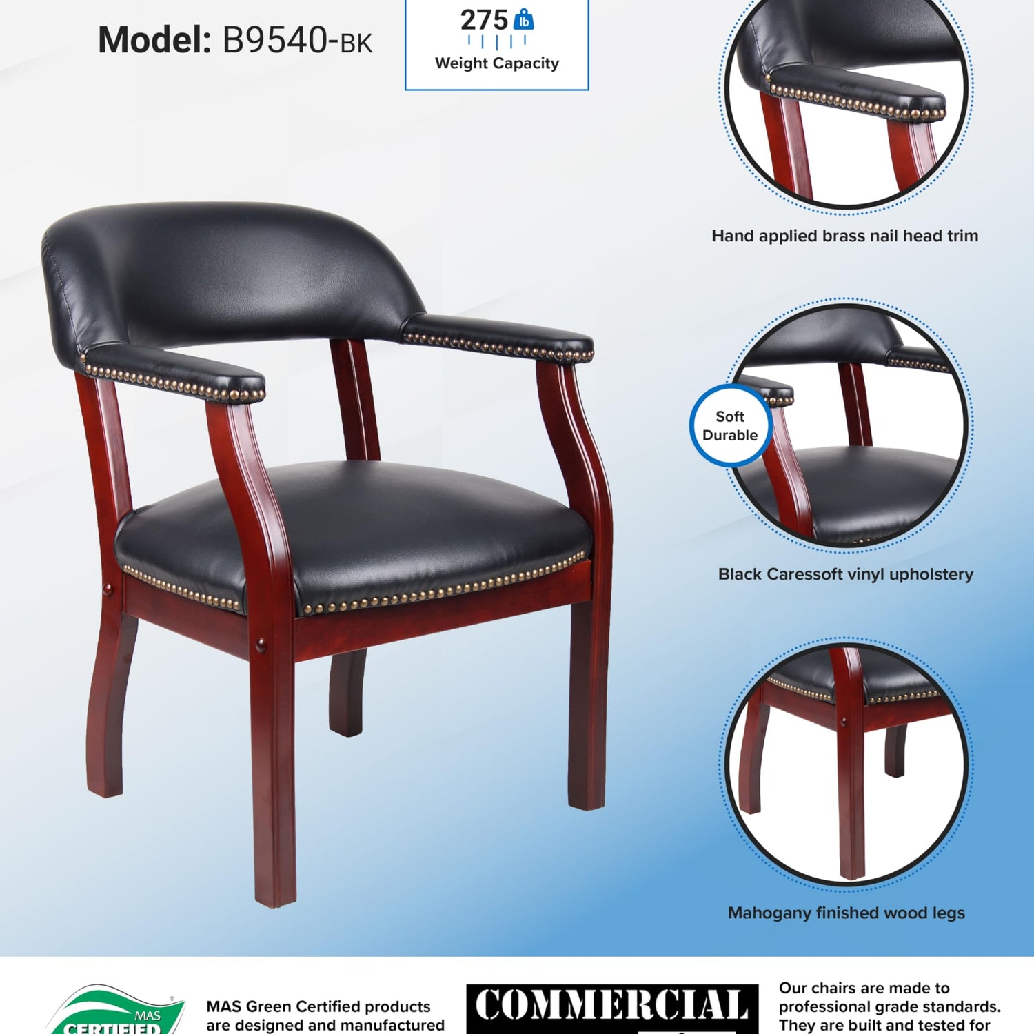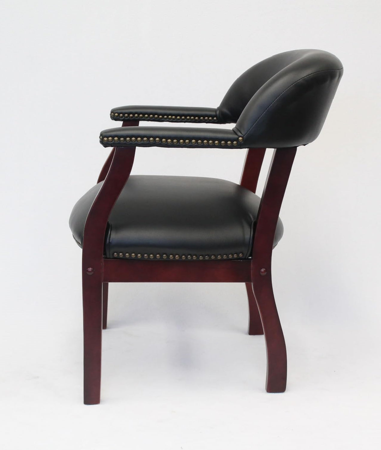 Details: The Boss Captain's Chair In Black Vinyl offers a traditional look with classic features like hand applied individual brass nail head trim. This Boss Office Products unit wows with a no-sag spring seat that will keep you correctly positioned while sitting in the chair. The sturdy frame is made out of wood with a mahogany finish, while the seats are covered with a soft vinyl. The seats are durable and easy to clean and have the following measurements: 24" W x 26" D x 31" H. Since the chairs weigh just 29 pounds, they are easy to reposition as necessary. Although this model does not have casters, model B9545 does.