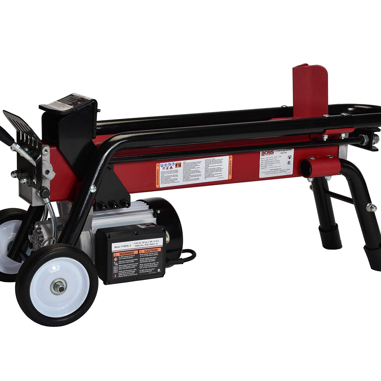 Details: The Boss Industrial ES7T20 is among the Top Rated Electric Log Splitters offering unparalelled quality and performance with its patented technologies. It offers the same convenience and portability of our EC5T20, but ramps the power up a notch to tackle larger projects! The powerful 2 HP electric motor delivers 7 tons of splitting force with of the harmful emissions that come with gas-powered units, allowing users to split indoors and outside. Built-in side rails keep logs stable while splitting, and the front handle allows for easy maneuvering. A patented hydraulic system and one-handed operation make Boss Industrial electric log splitters stand out from the rest of the pack.