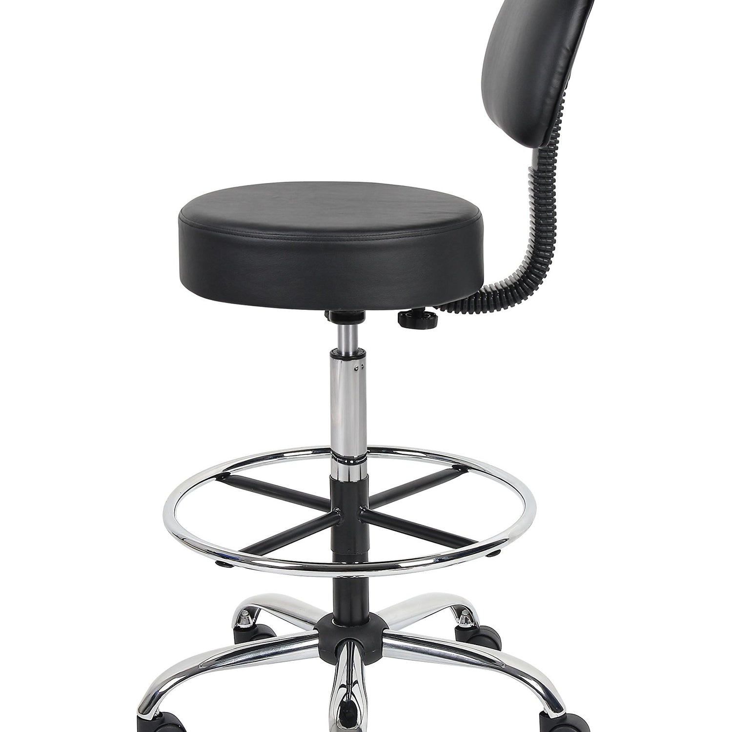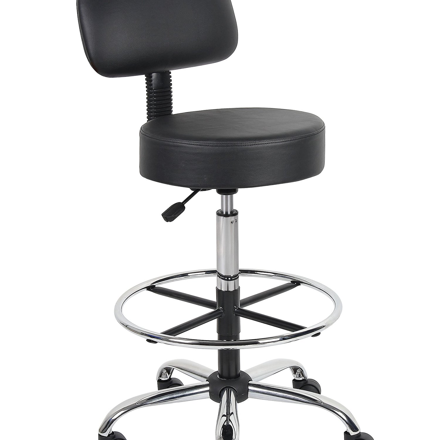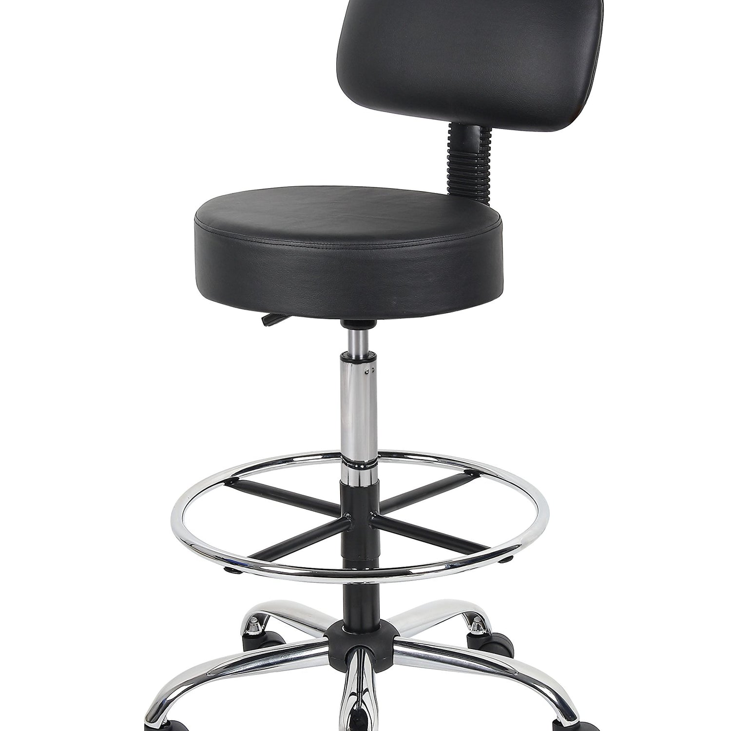Details: The Boss B16245-BK Caressoft Medical/Drafting Stool W/ Back Cushion is a functional and stylish addition to any home office or work place. The stool has a compact design measuring 25"W X 25"D X 41"-47" H, a quiet pneumatic lift function to adjust the seat height and a removable chrome foot ring. Its versatility, combined with a durable black Caressoft vinyl covering that is easy to maintain, makes this product suitable for a range of settings from a doctor's surgery to a home studio. The ergonomic back design emulates the shape of the spine, and the five-star base has sturdy dual-caster wheels for smooth gliding, improving comfort and promoting productivity.