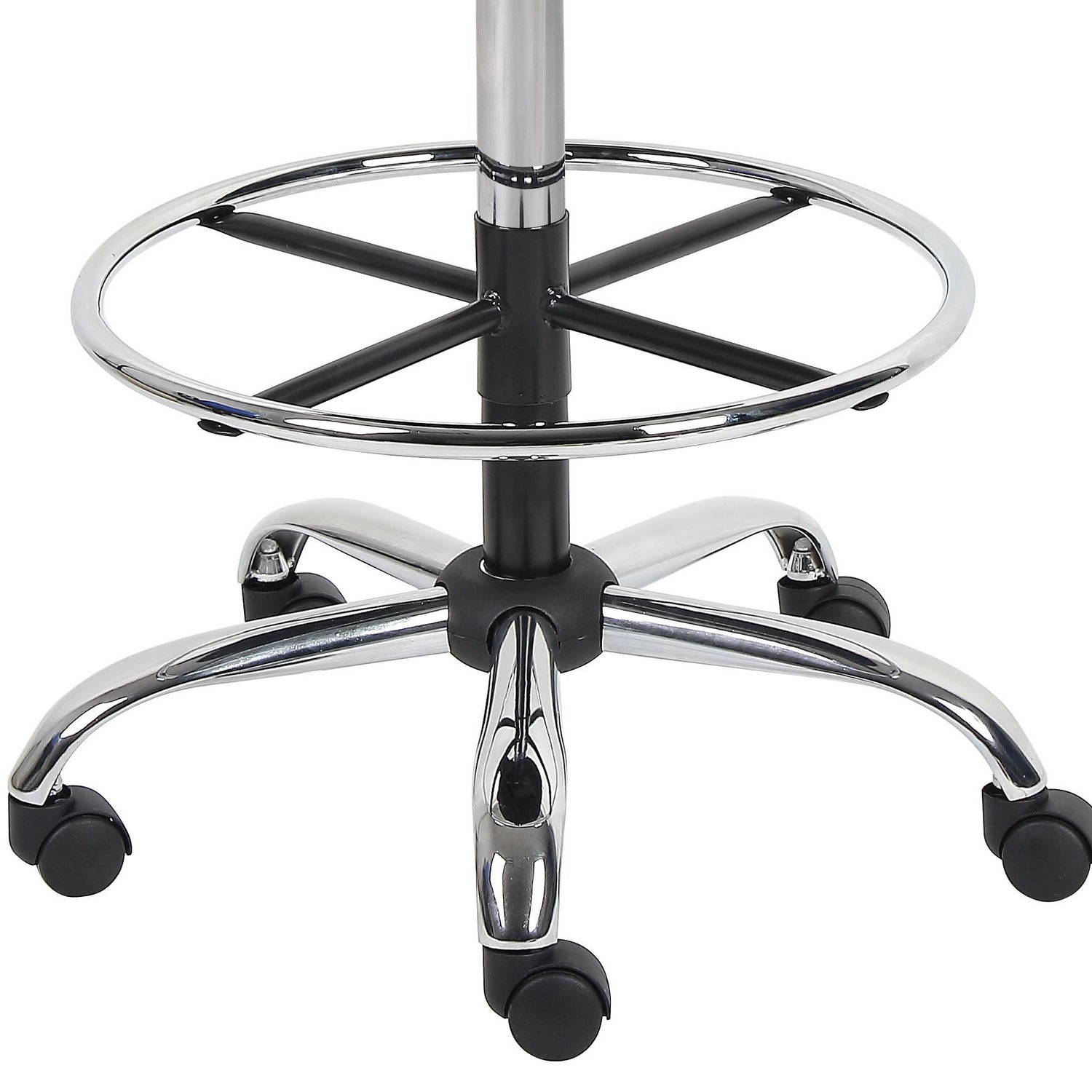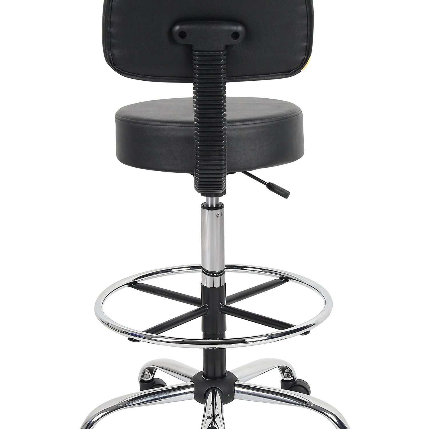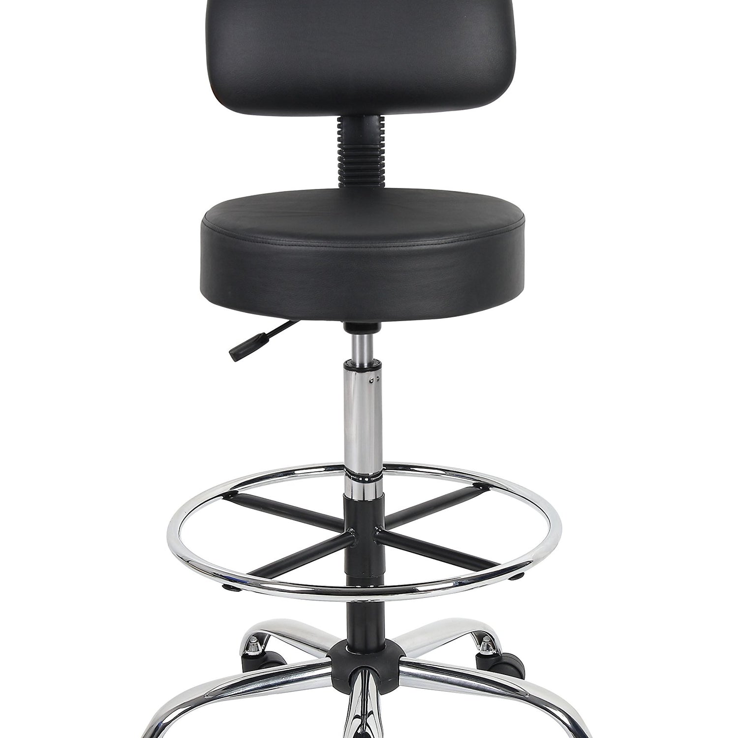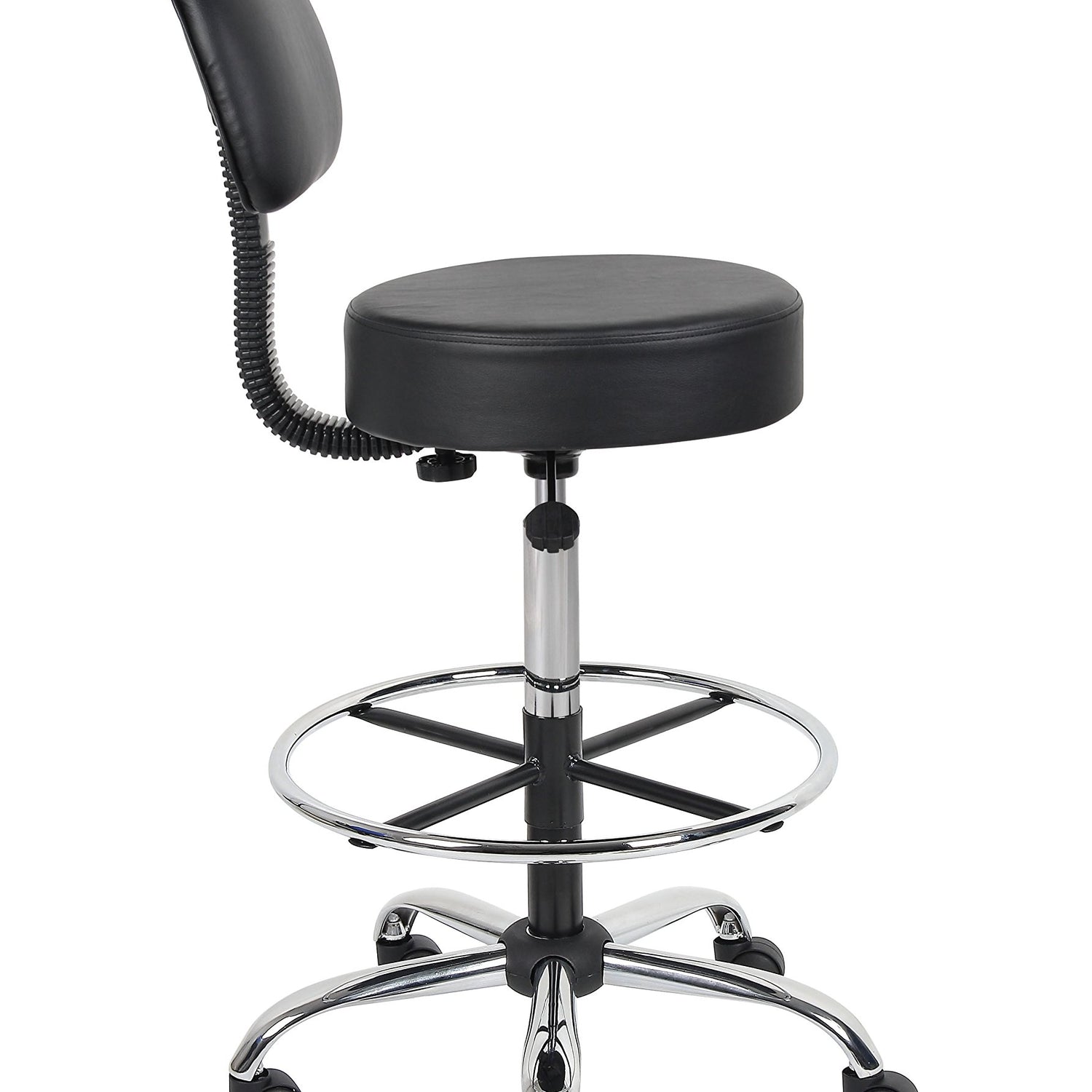 Details: The Boss B16245-BK Caressoft Medical/Drafting Stool W/ Back Cushion is a functional and stylish addition to any home office or work place. The stool has a compact design measuring 25"W X 25"D X 41"-47" H, a quiet pneumatic lift function to adjust the seat height and a removable chrome foot ring. Its versatility, combined with a durable black Caressoft vinyl covering that is easy to maintain, makes this product suitable for a range of settings from a doctor's surgery to a home studio. The ergonomic back design emulates the shape of the spine, and the five-star base has sturdy dual-caster wheels for smooth gliding, improving comfort and promoting productivity.