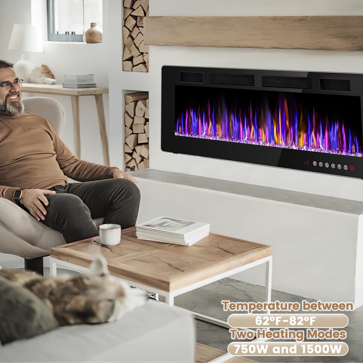 BOSSIN 72" Electric Fireplace Wall Mounted and Recessed with Remote Control, Low Noise, 750/1500W Ultra-Thin Wall Fireplace Heater and Timer Adjustable Flame Color and Brightness with Crystal