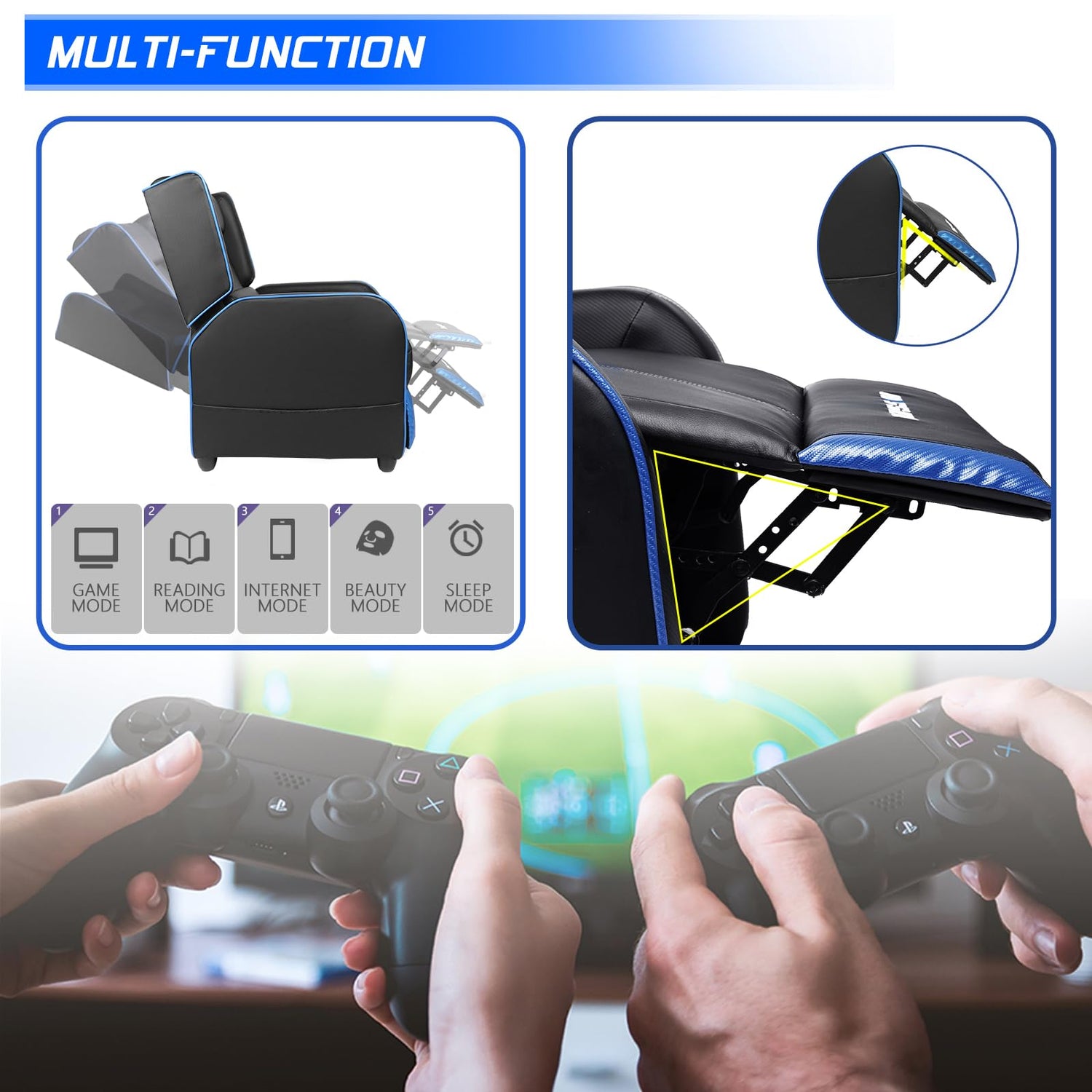 BOSSIN Gaming Recliner Chair for Adults 400lbs Racing Style Sofa Big and Tall PU Leather Recliner Seating Modern Ergonomic Lounge Recliner Chair Comfortable Home Movie Theater for Living Room(Blue)
