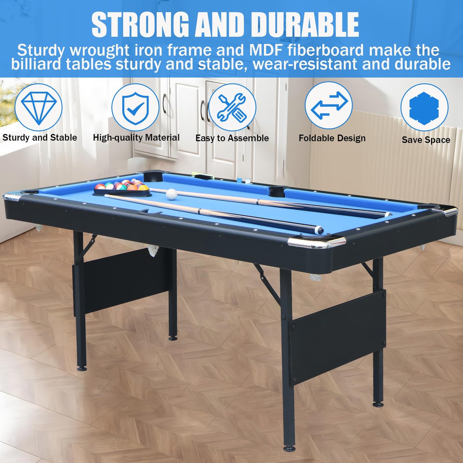 BOSTANA 5.5 ft Pool Table, Billiards Table with Balls, Cues, Chalks and Brush, Portable Foldable Pool Table Perfect for Family Game Room, Blue Black
