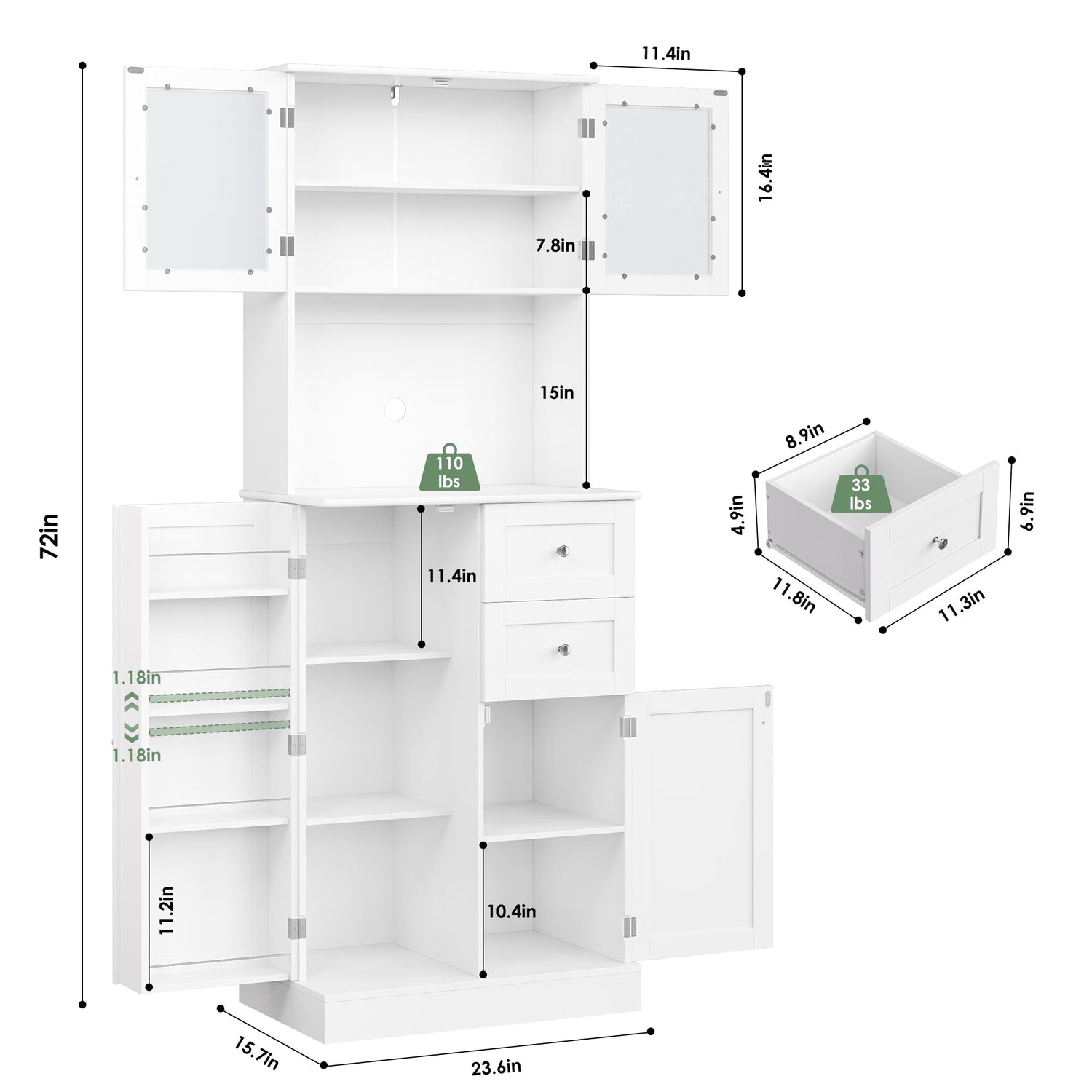 - The kitchen pantry cabinet is designed with thoughtful dimensions, measuring just 23.6 inches in width. This means it won't take up too much space in your cozy home! At a height of 72 inches, it offers plenty of storage layers, making it perfect for all your kitchen supplies, from pots and pans to spices and more