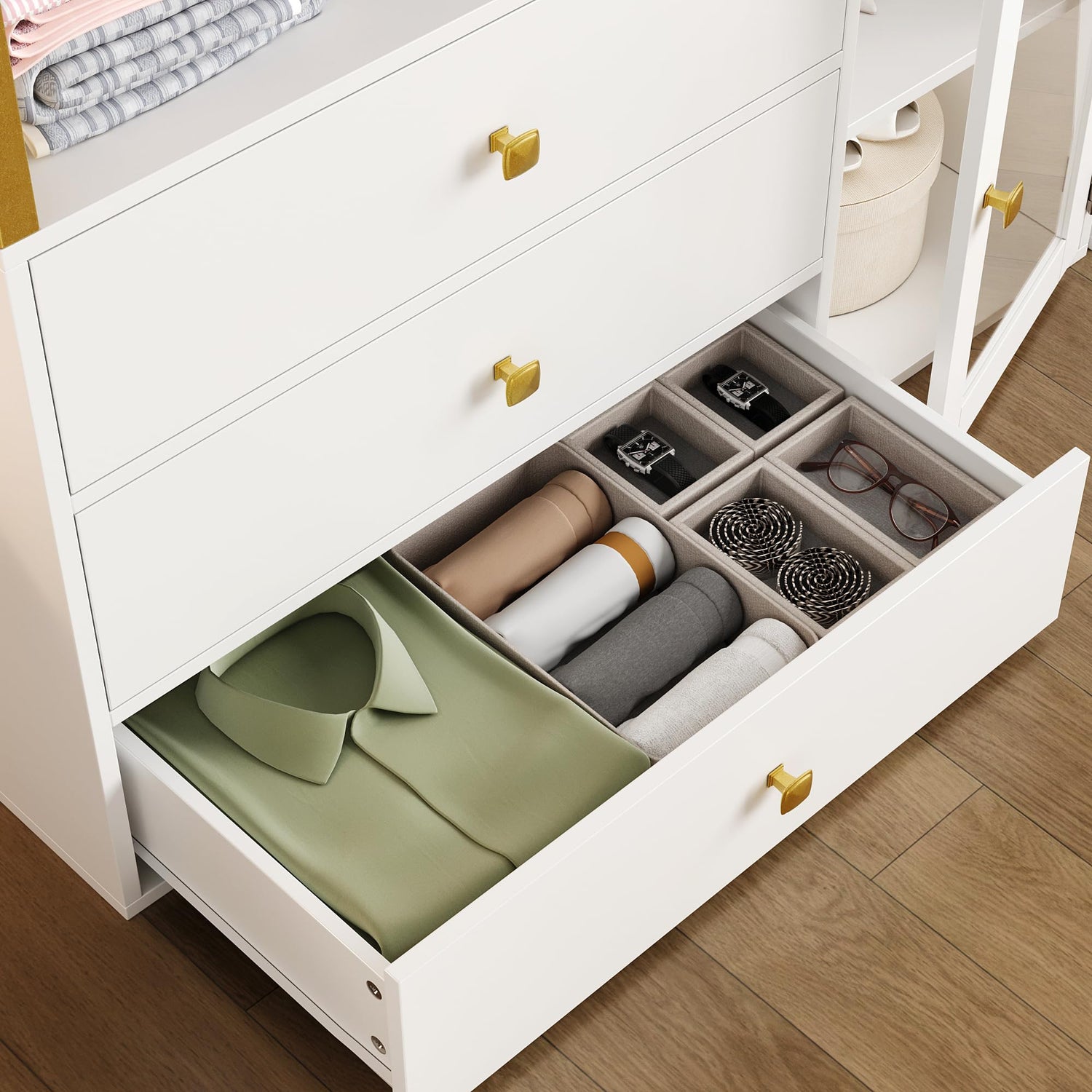 - Ample Storage: With a hanging rod height of 56.6”, 4 shelves, 3 drawers, and 1 cabinet with a door, this wardrobe provides ample storage space for your clothes, shoes, and accessories. Wooden open shelves and large wooden drawers can hold more and heavier items than wire mesh and cloth drawers