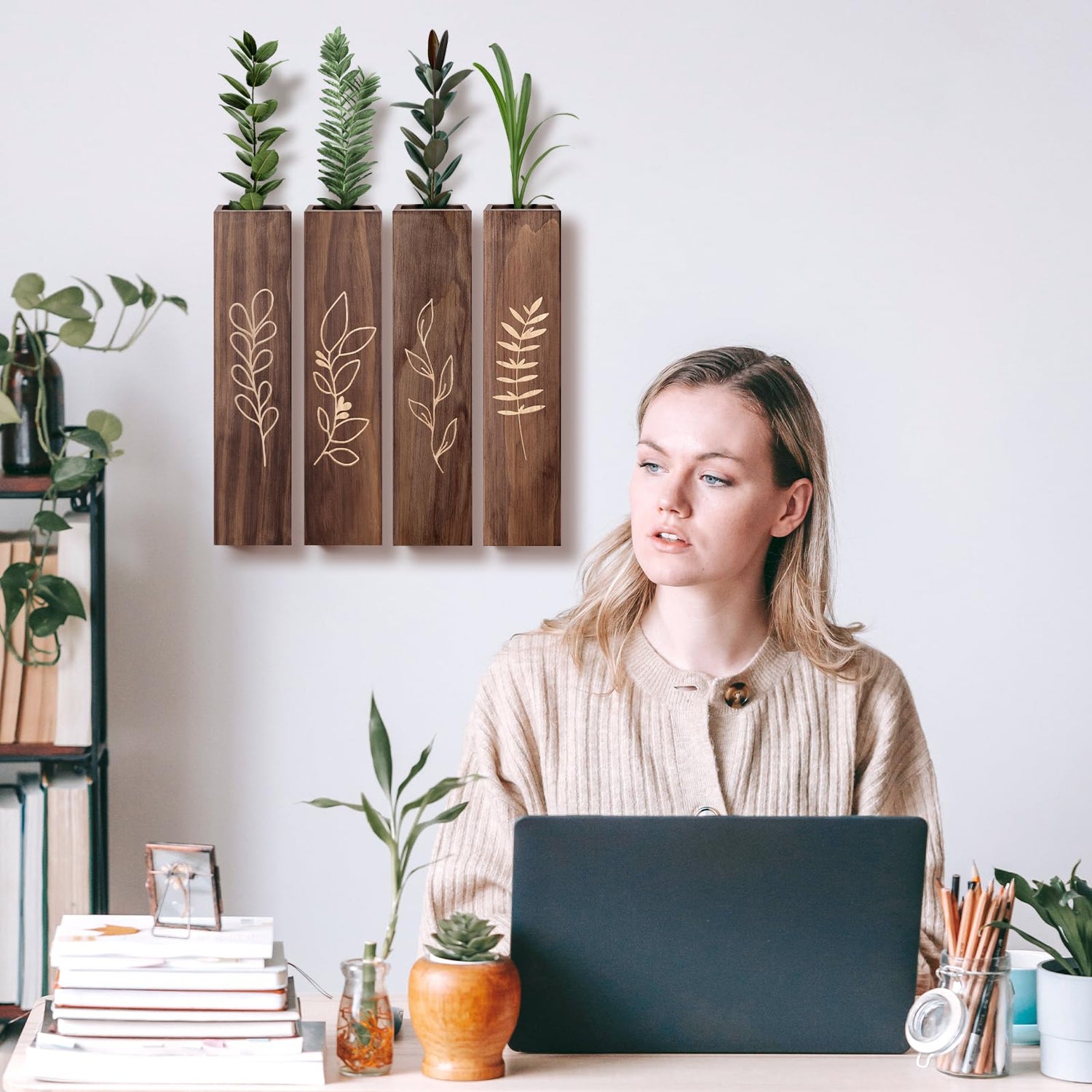 Details: Wood Wall Planter Indoor Wall Decor for Living Room Bedroom, 4 Pack Pocket Vases for Dried Flowers Faux Greenery Plants