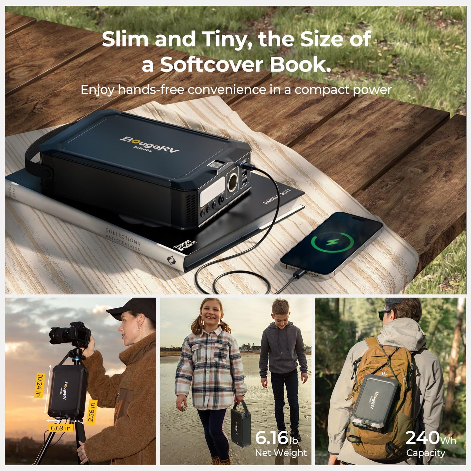 - Small and powerful: Compared with other traditional 300Wh portable charging stations, JucieGo 's shape design is more compact and slim. It is 70% smaller than similar products, which can be easily carried and put in a backpack like books