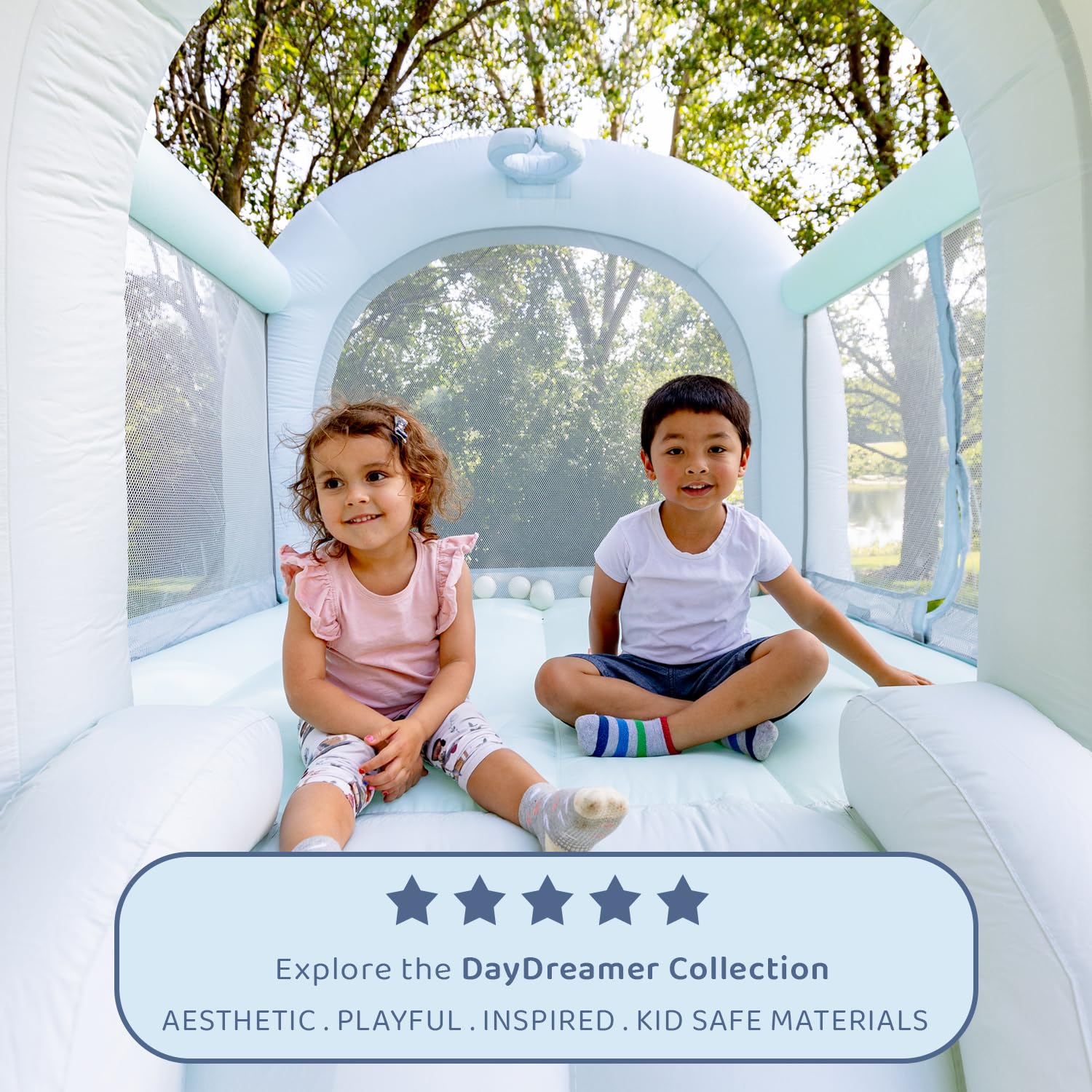 Bounceland Daydreamer Mist Bounce House, Pastel Bouncer with Slide, 8.9 ft L x 7.2 ft W x 6.7 ft H, UL Blower Included, Basketball Hoop, 30 Pastel Plastic Balls, Trendy Bouncer for Kids