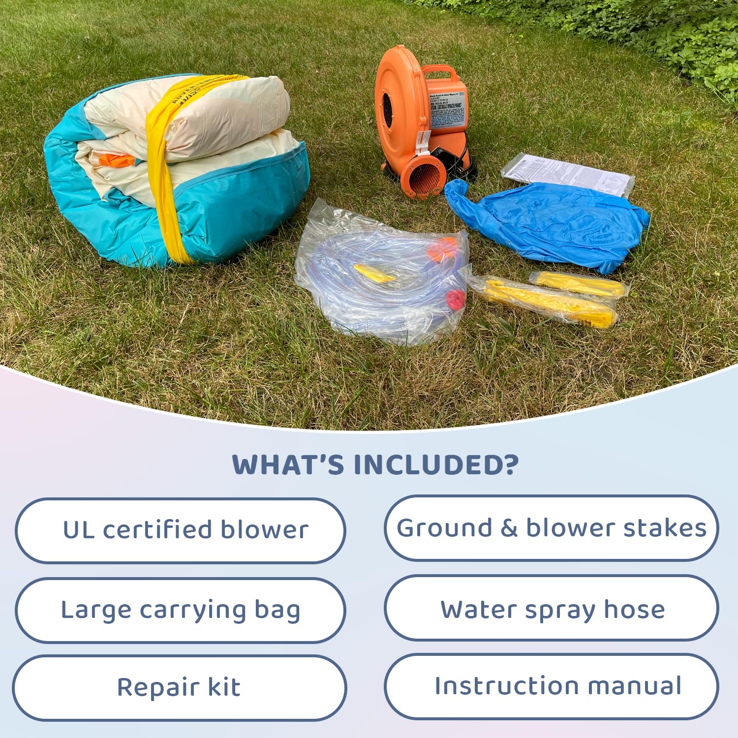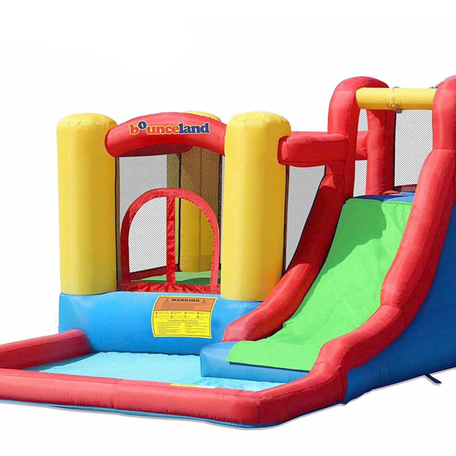 - 【Specifications】1) Product Size: 11.5 ft L x 9 ft W x 6 ft H, 4.5 x 4.25 jumping area, 6.5 foot slide, 6.5 x 4.8 pool area, basketball hoop, and climbing wall. 2) Package includes: bounce house, blower,Basketball hoop,Water hose,Ground stakes pack,Carrying bag,Repair kit and instructions 3) Weight limit: Max weight: 300 lbs, Max individual weight: 100 lbs. Max number of kids: 3 kids 4) Easy set up and take down, inflates in less than a minute. Perfect for indoor and outdoor use.